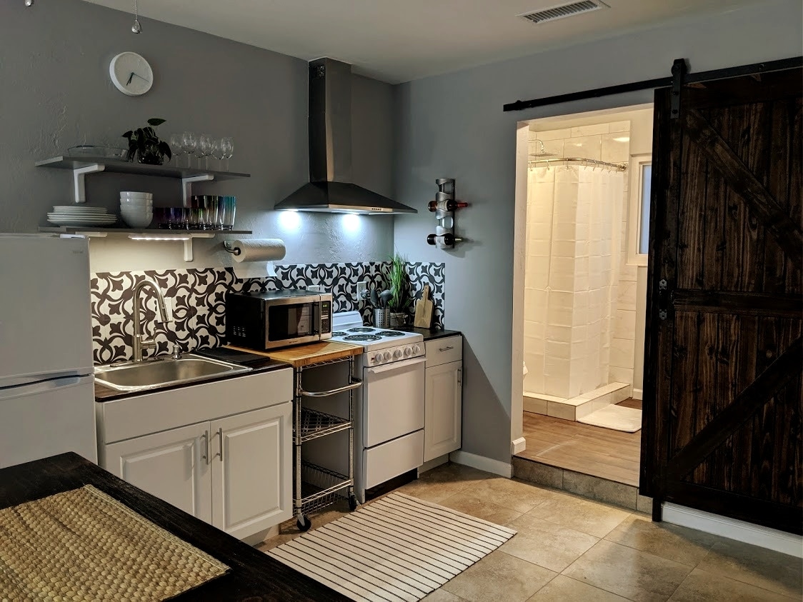 This cozy room has is own entrance and private full bathroom. It has a well lit private entrance with keypad door lock. Perfect for single/couple. - Queen bed - Full bathroom - In-room kitchenette with mini fridge, microwave, toaster oven, keurig & washer/dryer - 2 comfortable sitting chairs - Lg Roku TV -Access to the back yard w large shared wood deck, eating space, & a swing in natural garden setting -Attached to our lovely home located near the end of a cul-de-sac.