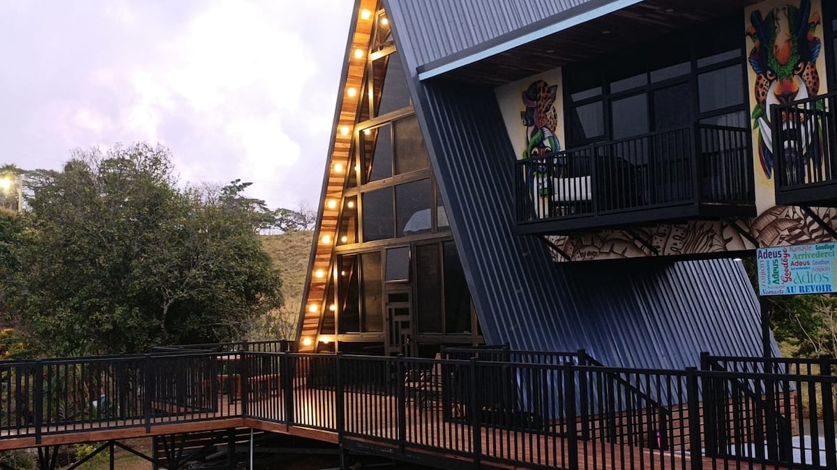 A Frame House es un refugio único en la montaña con privacidad total, vistas al mar y montañas, atardeceres mágicos y noches estrelladas. Disfruta de una finca privada, sala con TV y juegos, cocina equipada, comedor, habitación y terraza panorámica. A 15 minutos de Monteverde. Un escape perfecto para desconectar y conectar con la naturaleza. Reglas: Check-in: 3:00 p.m. Check-out: 11:00 a.m. No ruido después de las 10 p.m. No fumar dentro. ¡Reserva y vive la magia!