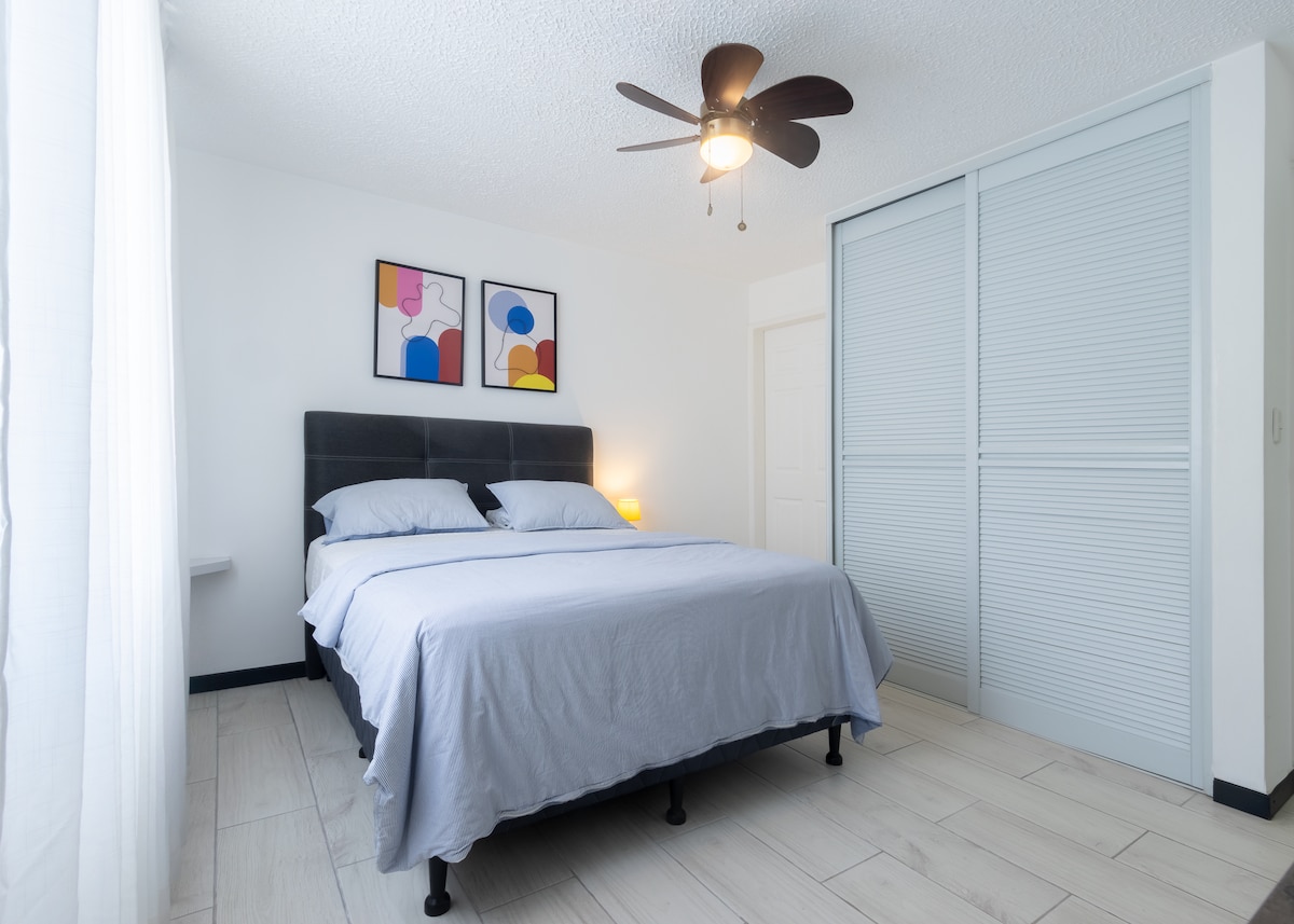 The condo has 2 bedrooms, a living room, dining room, kitchen, 2 bathrooms, and is located 2 miles from SJO Airport. Additionally, you’ll be just 2 minutes away from City Mall and Walmart. • Airport Transfer Available (at an additional cost) • 24/7 security • Pool • Gym • Coworking space • High-speed internet • Clubhouse • Parking You'll find in the apartment coffee, a fully equipped kitchen, AC units (in the bedrooms and living room), TV, king-size bed, and full-size bed.