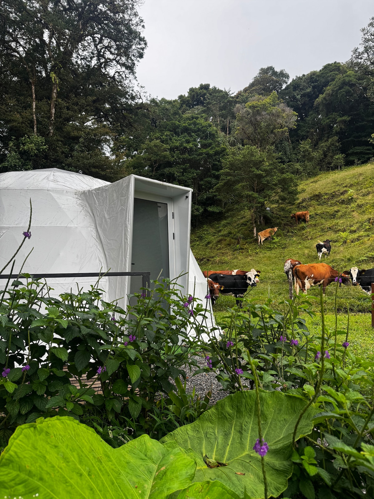 Immerse in lush green of nature and astounding views , transport yourself into a unique experience staying in this luxury glamping dome perfectly located at just 35 minutes from SJO airport and Alajuela city, 5 minutes from Hacienda Alsacia Starbucks Coffee farm, and minutes away from La Paz Waterfalls Gardens and Poas Volcano. This unique dome is equipped with everything you need from King size bed to hot showers, kitchenette, terrace and much more.
