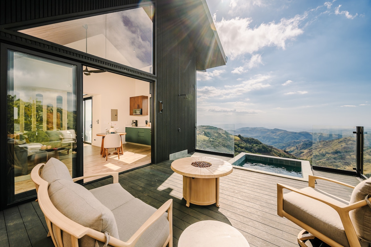 Relax in this modern mountain cabin surrounded by nature in the hills of Zarcero. From the terrace you can watch mist move across the valleys and enjoy wide mountain views that, on clear days, may reach the Gulf of Nicoya and even Arenal Volcano in the distance. Sunsets here are magical. As the air cools after 5 pm, light the fire pit, grab a warm drink or a glass of wine, and enjoy the peaceful mountain atmosphere.