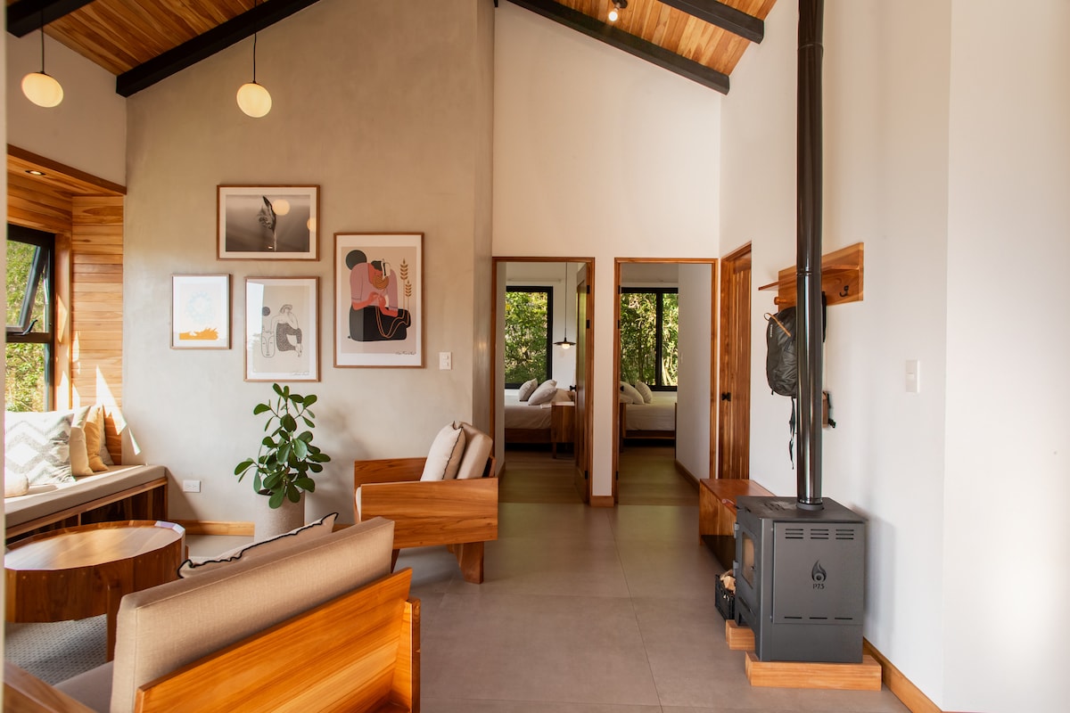 Jaguar Houses is conveniently located between the center of town and some of the most popular attractions in the area such as Canopy Zip Lining, Suspended Bridges and the Santa Elena Nature Reserve. Inspired by Nordic architecture, Jaguar is composed of 3 independent homes, elevated on pillars, giving you the impression of floating on the trees. The 3 houses are identical however the view can slightly change from one to another. The photos used for each listing are a mix of the 3 houses.