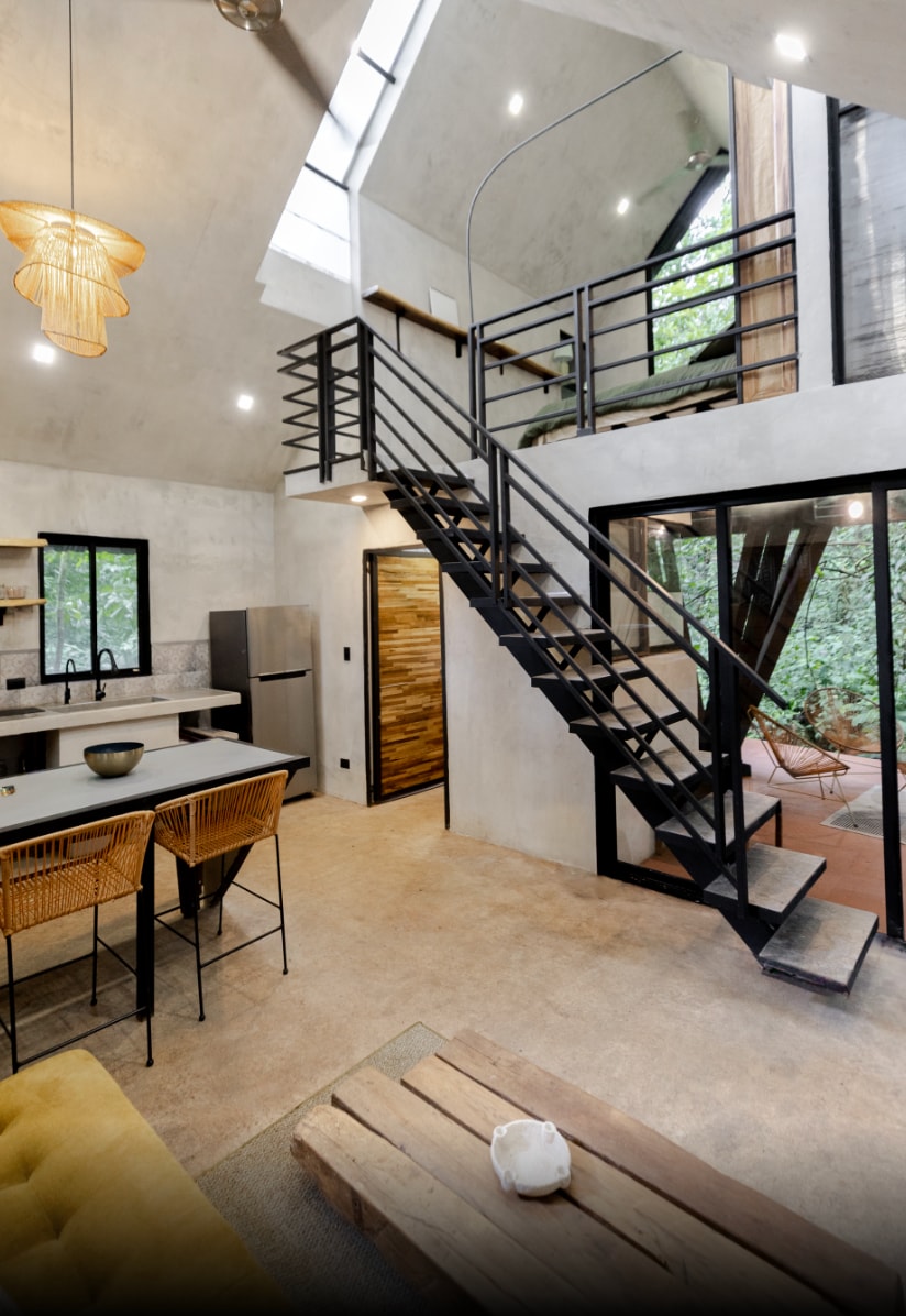 This space is very quiet, enhanced to enjoy nature right from your own terrace. It offers a studio feel with the size of a Casita, offering a Queen bed, a complete bathroom with hot water tank, kitchenette with all the needed cooking utensils, sitting area indoor and outdoor with comfy space, ideal for couples. The forest is your backdrop from this cozy space, it allows you the opportunity to spot tropical bird residents, wildlife, and tropical flowers right from your private terrace.