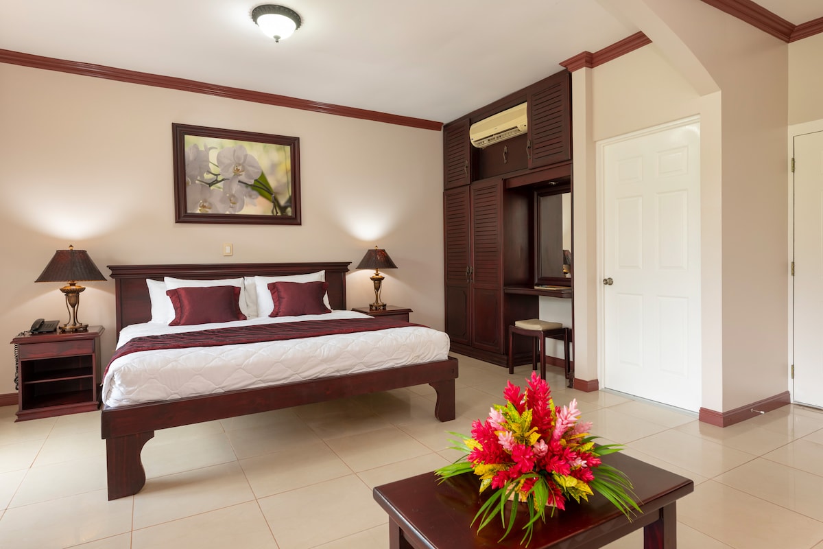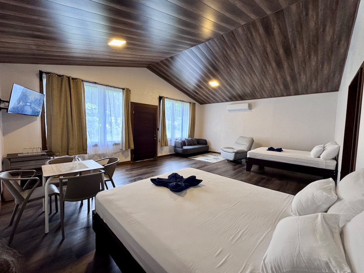 Hotel Boutique Casa del Río Spacious room with a King bed, twin bed, and a kitchenette, perfect for couples or small families. Features a private balcony with pool view, air conditioning, Wi-Fi, smart TV, and a bathroom with hot water. Guests have access to all hotel amenities: restaurant, pools, Jacuzzis, gym, basketball court, three padel courts, and a semi-Olympic pool. Breakfast included at our restaurant with views of the Arenal Volcano.