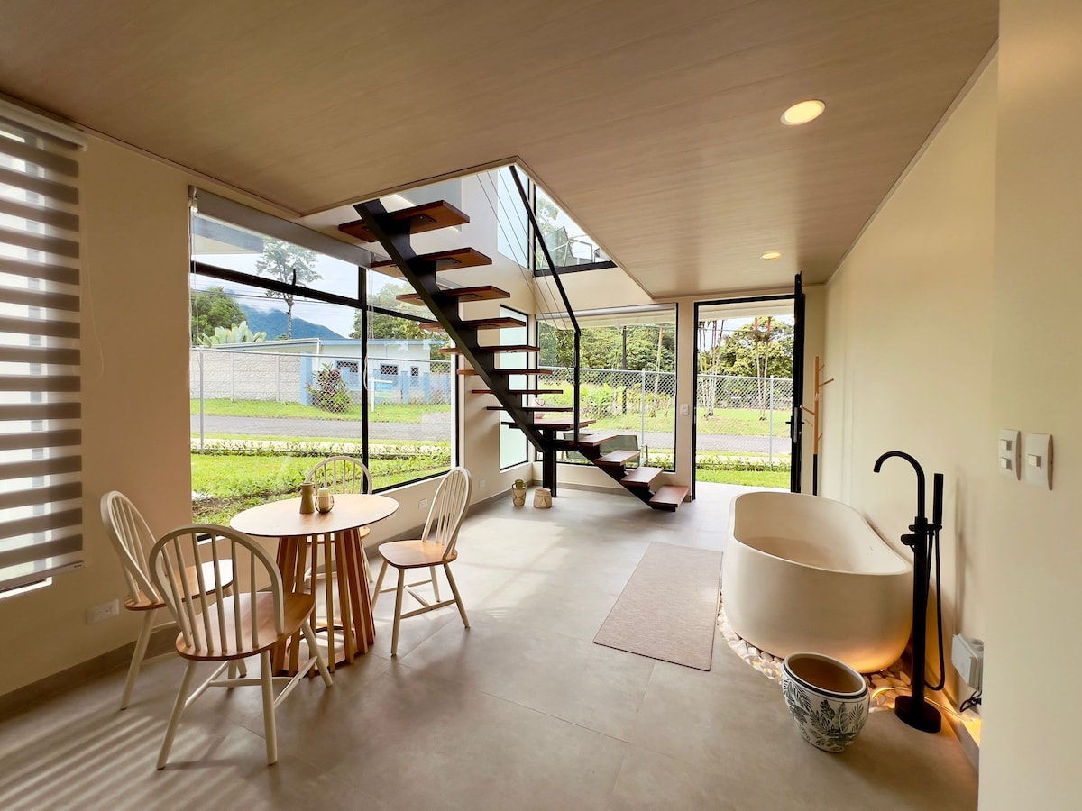 Relájate en este espacio tan tranquilo y elegante. A 1 km del centro de Fortuna y a 300 m del Salto. Camino a la catarata de la Fortuna. El loft cuenta con terraza deck, piscina, jardín, un cuarto con cama king, baño, cocina totalmente equipada, centro de lavado, parqueo privado, AC, acabados de lujo, vistas extraordinarias hacia el volcán y en contacto con la montaña, ideal para citas románticas, relajarse y pasarla bien lejos del bullicio de la ciudad, pero a solo 2 min del centro de Fortuna.