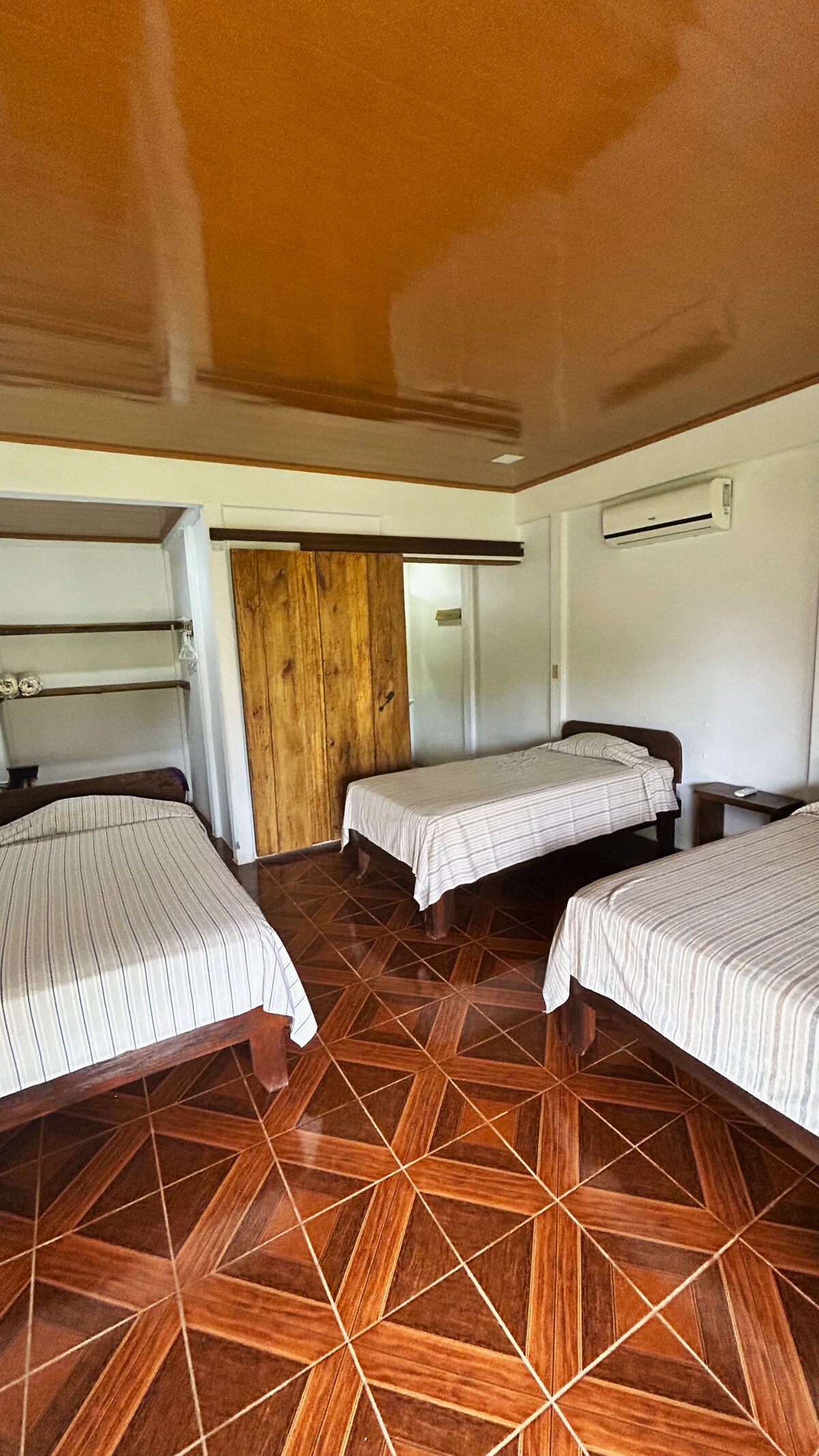 Apartamento privado con entrada independiente, equipado con Aire acondicionado, cocina completa, refrigerador, dos camas dobles con colchones confortables, cuna para bebé (opcional), silla para bebé (opcional), baño con agua caliente, horno microondas, espacioso para venir en familia, cuenta con áreas verdes para jugar con los niños y/o mascotas, contamos con lavadora de ropa en la misma propiedad. El parqueo es bajo techo Tenemos huerto y frutos que pueden disfrutar sin costo adicional