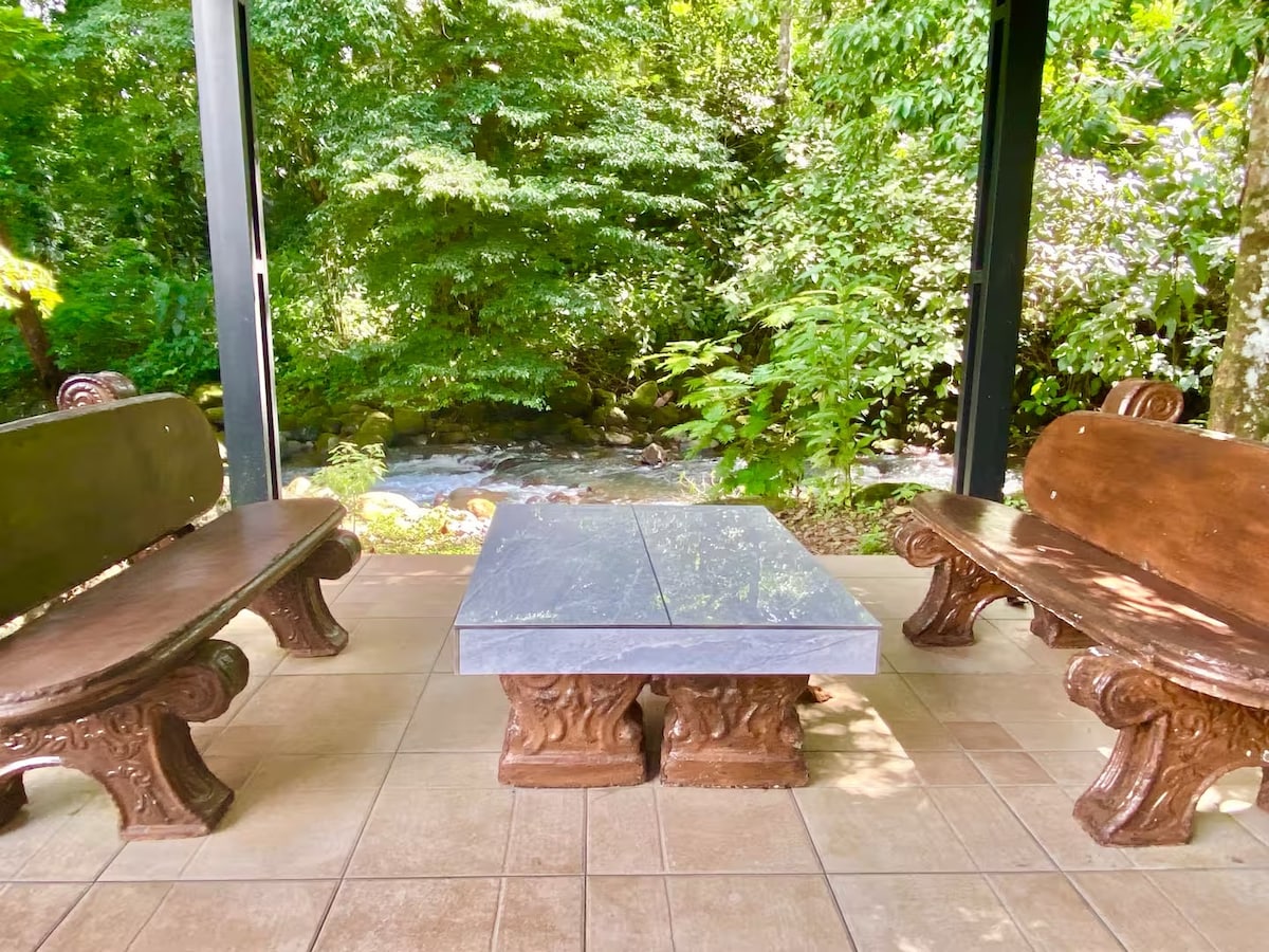 Enjoy absolute and complete privacy, surrounded by 250 Acres of Rain Forest. Immerse yourself in lush forest with beautiful river views. This Cabin is just a few feet from the river. Take it easy at this unique getaway. Connect with nature and relax. You will experience absolute peace and tranquility. Surrounded by beautiful wild animals and birds such as Tucans, humming birds and pizotes. All of this in complete privacy. Take a 1.4 km hike to a stunning 145 feet waterfall within the property.