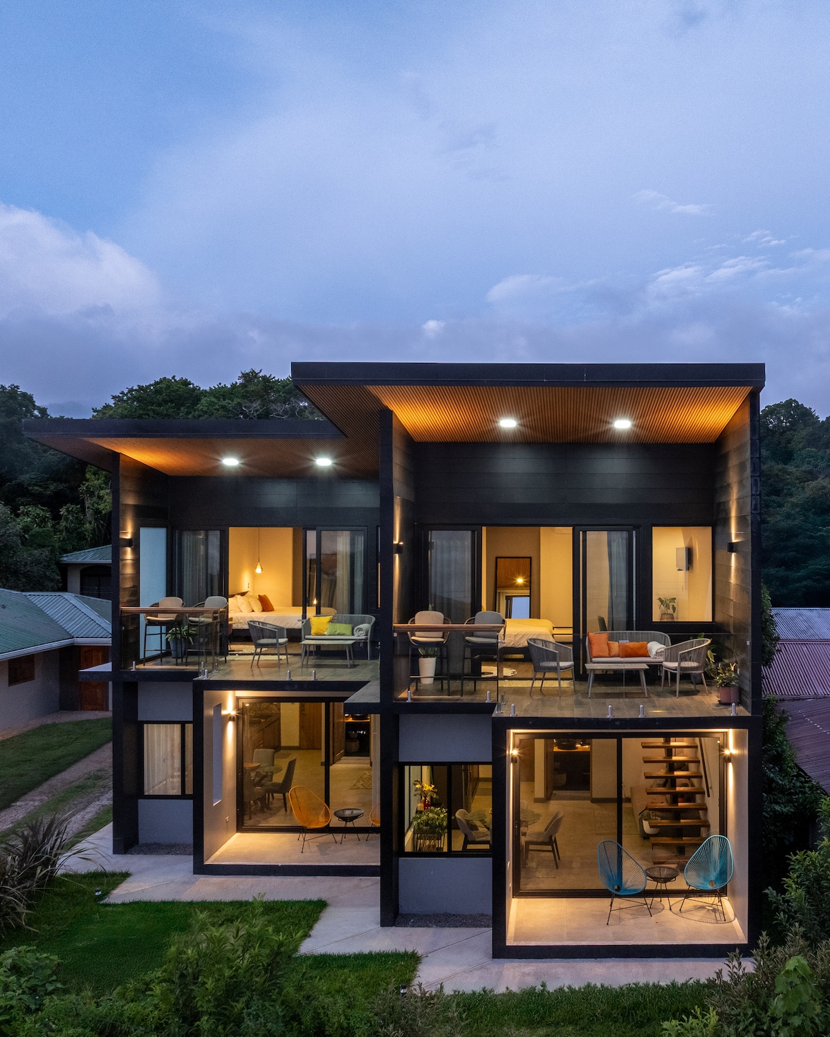 Jaguar Houses is conveniently located between the center of town and some of the most popular attractions in the area such as Canopy Zip Lining, Suspended Bridges and the Santa Elena Nature Reserve. Inspired by Nordic architecture, Jaguar is composed of 3 independent homes, elevated on pillars, giving you the impression of floating on the trees. The 3 houses are identical however the view can slightly change from one to another. The photos used for each listing are a mix of the 3 houses.