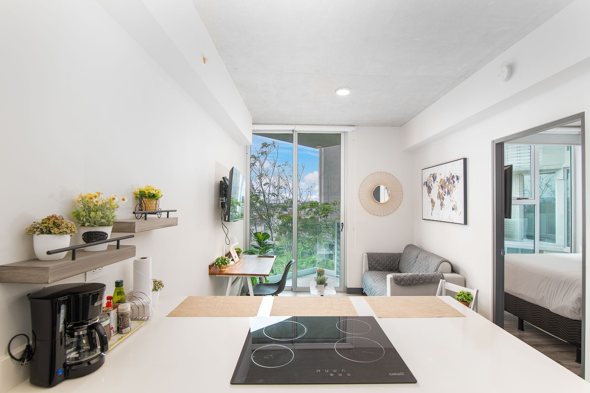 Our Amazing apartment is strategically located in an Exotic, Unique, Hip, Cool, and Relaxing High Rise 5 Stars Resort Style Condo next to the building's own forest, pool, and lounge area, so you actually have direct access to it from the apartment! This Resort Style Building has it all, Pool, Gym, Co-Working areas, 31st Story Terrace, Private Meeting Rooms, Theater Room, Landry, and its own bar in the first floor.