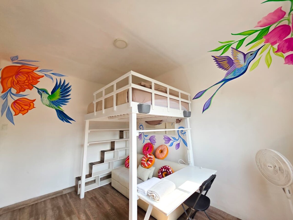 Excelente opción para parejas , habitación privada tipo capsula con cama matrimonial y 1 mesita, todos los baños son comunes, son 8 impecables, habitación parte Casa Kanabri Hostal Boutique, en la calle más emblemática de la Ciudad de México, Paseo de la Reforma, áreas comunes como sala de TV, patio trasero, Terraza con la mejor vista de la Ciudad, si buscas un lugar lleno de detalles pensados para ti, con la mejor decoración con murales graffitis, pinturas, artesanías ven con nosotros