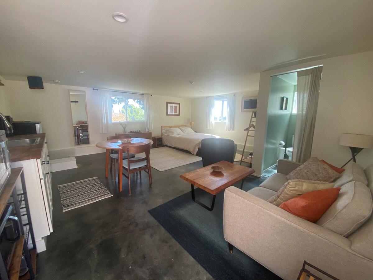 Detached Guest House that is on the same property of the main house. It is private, safe, and cozy 1br features a "Casper" queen bed. The living room features a twin-sized sleeper sofa, smart TV, and high-speed WIFI. Self-check-in with a keypad, for contactless and flexibility in arrival. Tesla EV charger also available to share For a more personalized experience, we kindly ask our guests to share the reason for their visit at the time of booking. Dogs are allowed with pet fee