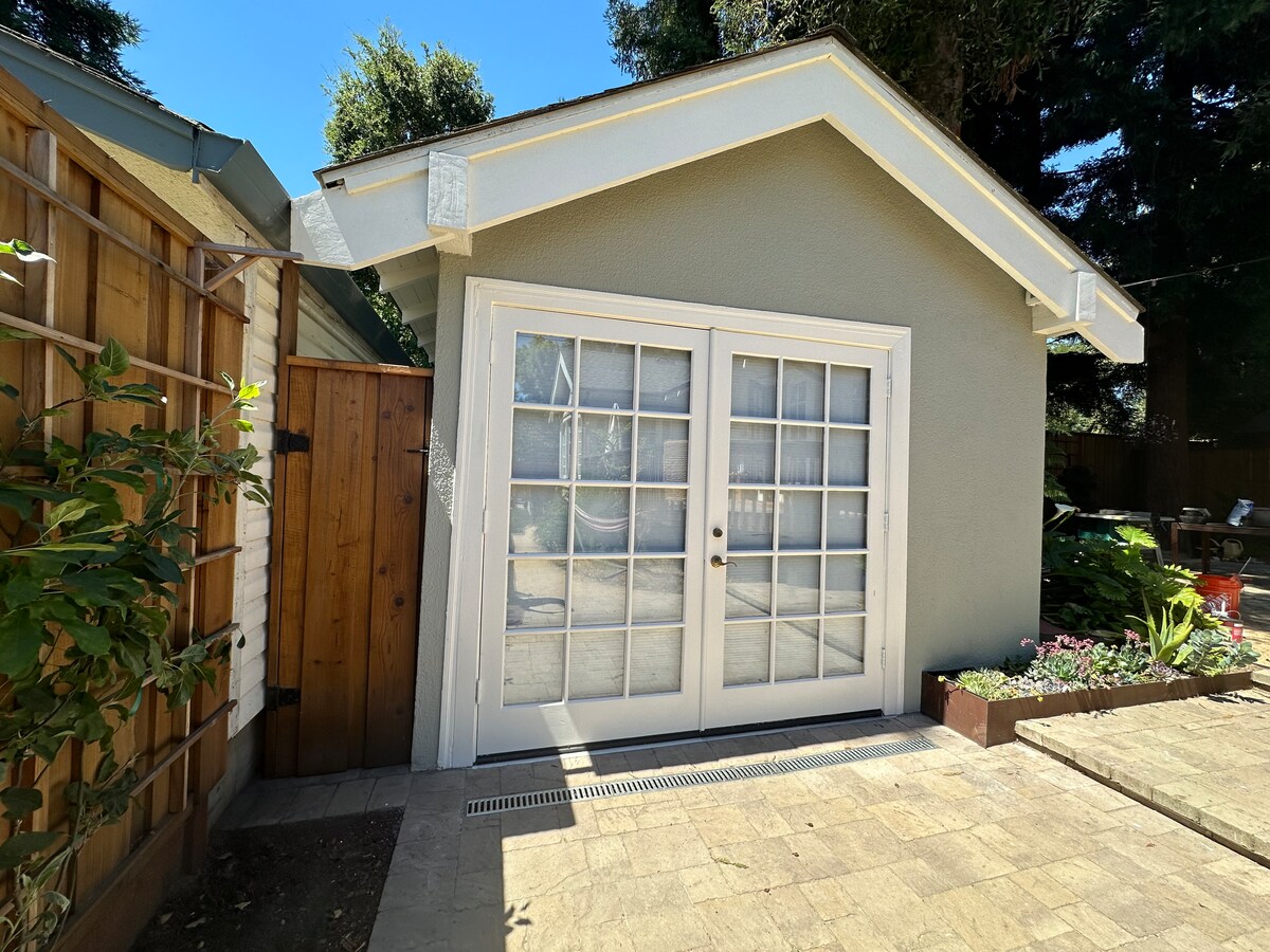 Newly renovated 100 yr old backyard studio in the heart of the Alameda island. Private fenced garden with bbq. 7 mins from Oakland Int. Airport. 20 mins to SF city by ferry. Convenient location to UC Berkeley. Close to BART, beach, parks, local markets and restaurants in walking distance. • Fully-equipped, self contained studio, with cooking basics, microwave, airfrier/oven, induction cooktop, coffee machine, electric water boiler, BBQ, patio. Private entrance. No share ventilation.