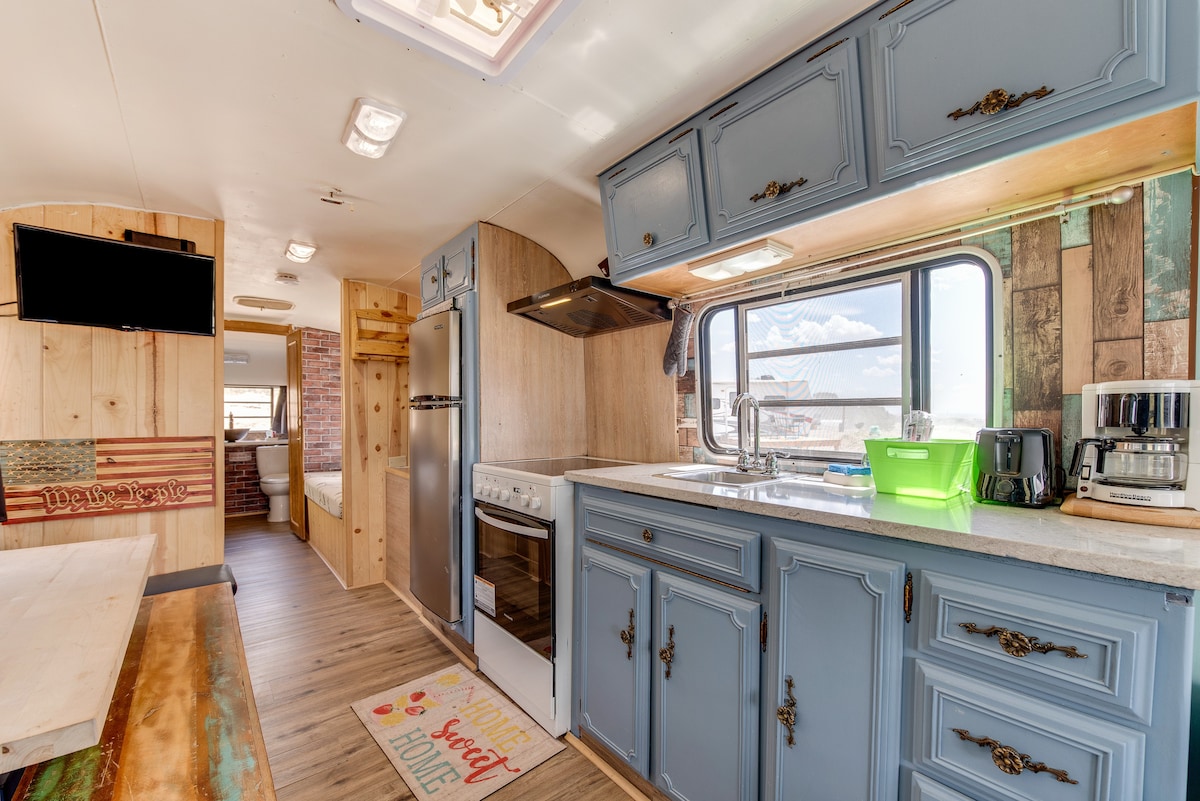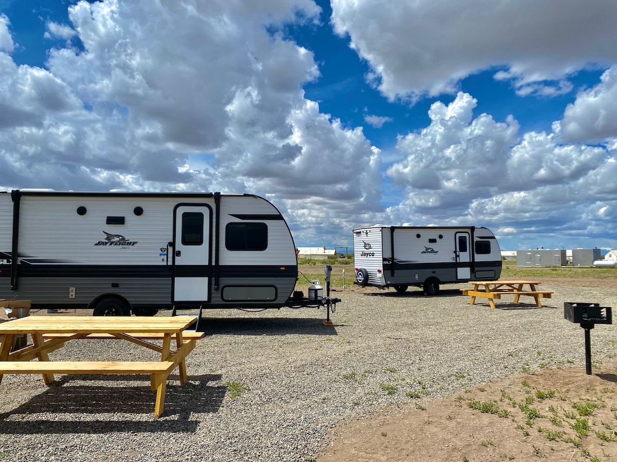 Each of our three 2024 Jayco Camper Cabins has a stocked kitchen and a bathroom with a queen bed + a single size bunk bed (200lb limit on each bunk). The kitchen table in each camper turns into an additional sleeping area (also 200lb limit). These Campers are located at Rustic Rook Resort, we also have furnished glamping tents and Grain Bin Studio Villas available to rent. Enjoy free S'mores each night by the Community fire, and bask in the views of the Dunes and stars right from your camper.