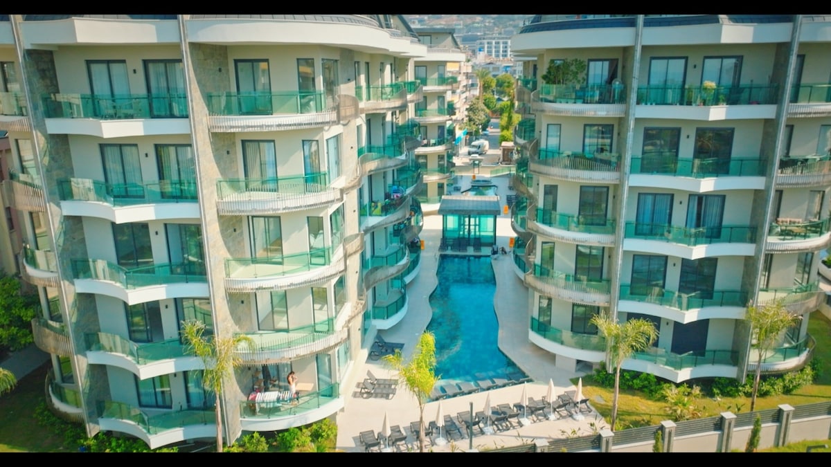 "Officially Licensed for short-term rental" Welcome to the Beach Haven, your relaxing vacation getaway place. This luxurious sea-view apartment lives directly on the coastline of Alanya -Outdoor pool ✔ -Indoor heated pool ✔ -Kids area ✔ -Garden ✔ -Turkish Hammam and Sauna ✔ -Gym ✔ -Private tunnel Beach access with sunbeds and umbrellas ✔ -TV, WIFI ✔ -24 hours security ✔ -Zero meters to the beach ✔ -Sea and mountain views ✔