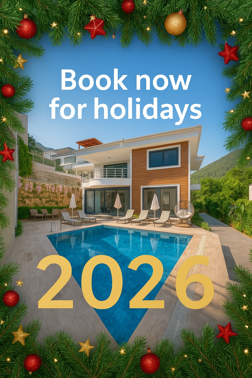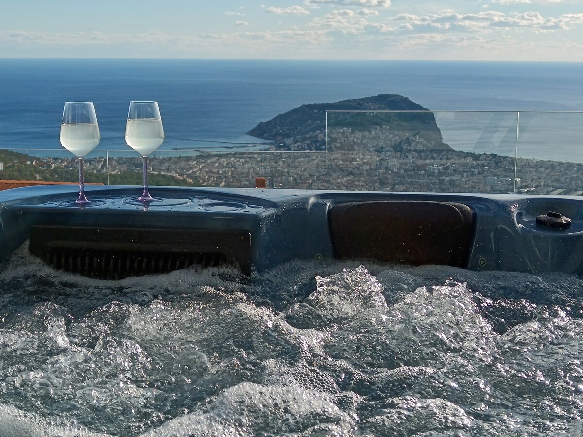 A villa with panoramaview to castle, Cleopatrabeach, Mediterrianian Sea with a 500 sqm terrace and 5x7 m pool (can be heated up if you want). Enjoy summer all year around. The villa has all facilities. The terrace 500 sqm consist many sittinggroups, coaches, baldakin, sunbeds, lots of space. Internet for connecting TV and partyboxmusic. You can create many activities on the huge terrasse for young and old. A more luxury villa for holidayliving is not to be found. Our family love it down here