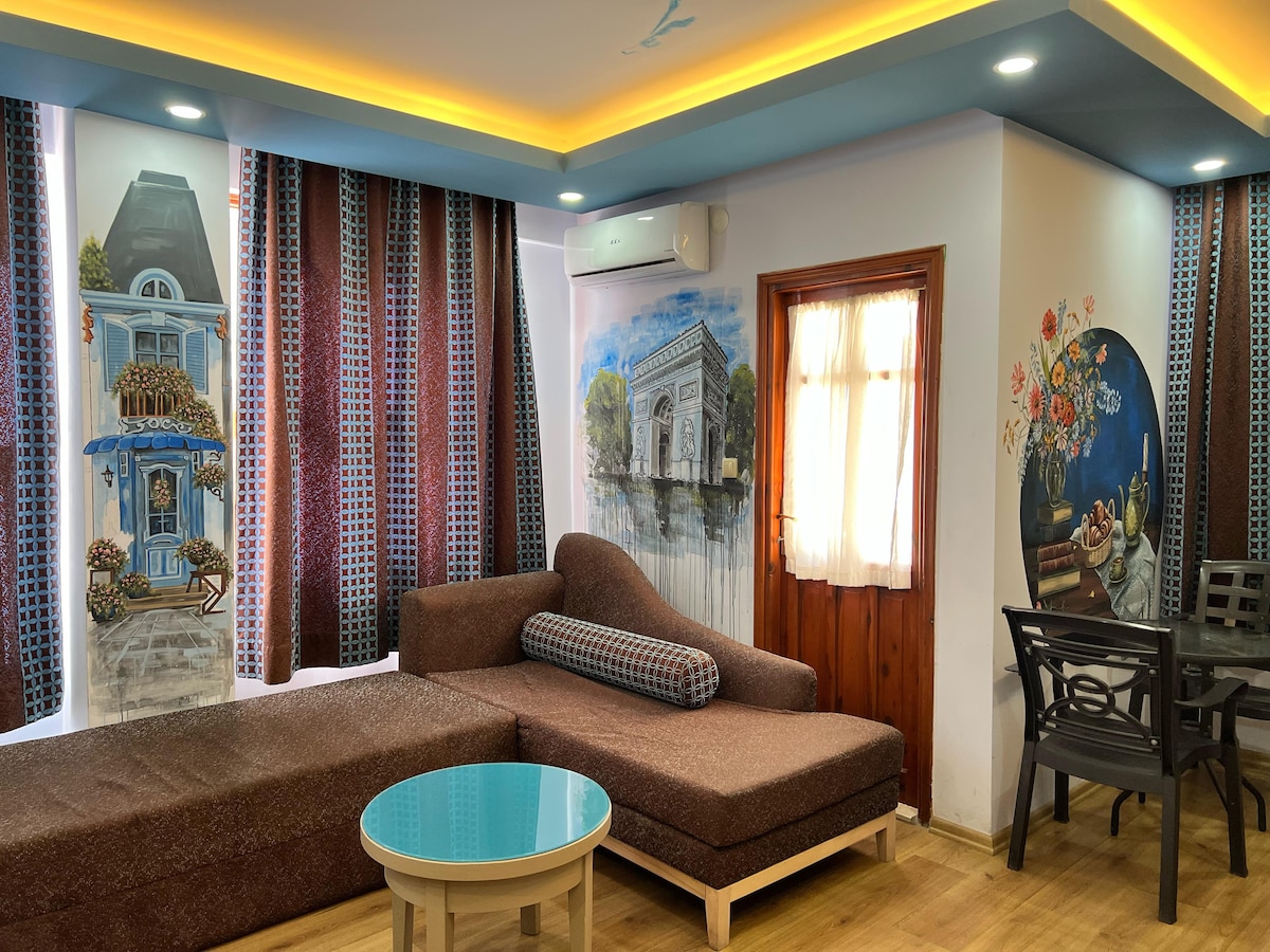 Best location ,50 meters to Cleopatra beach , walking distance to cable car , damlataş cave ,castle ,shops , restaurants and bus stop. Electric , water bills , housekeeping and wifi included in price.
