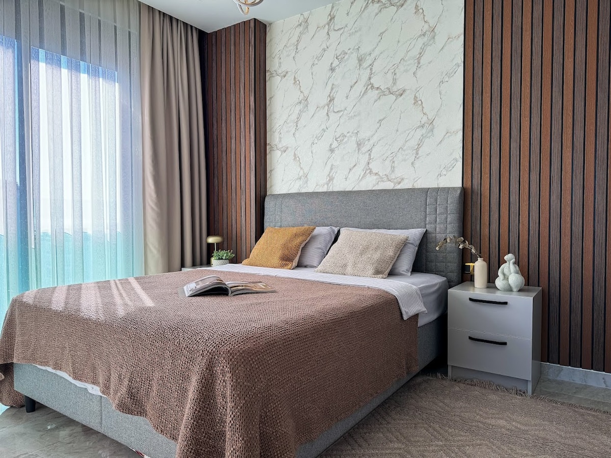 Уютная квартира 1+1, 60 м², с современным дизайном и всем необходимым для жизни. Расположена в комплексе с инфраструктурой уровня 5★: круглосуточная охрана, крытая и открытая парковка, караоке, кинозал, PlayStation-комната, хамам, сауна, бассейны. Всё, что только можно представить для отдыха и комфорта, доступно в вашем распоряжении. В квартире — полный набор удобств по самым высоким стандартам.