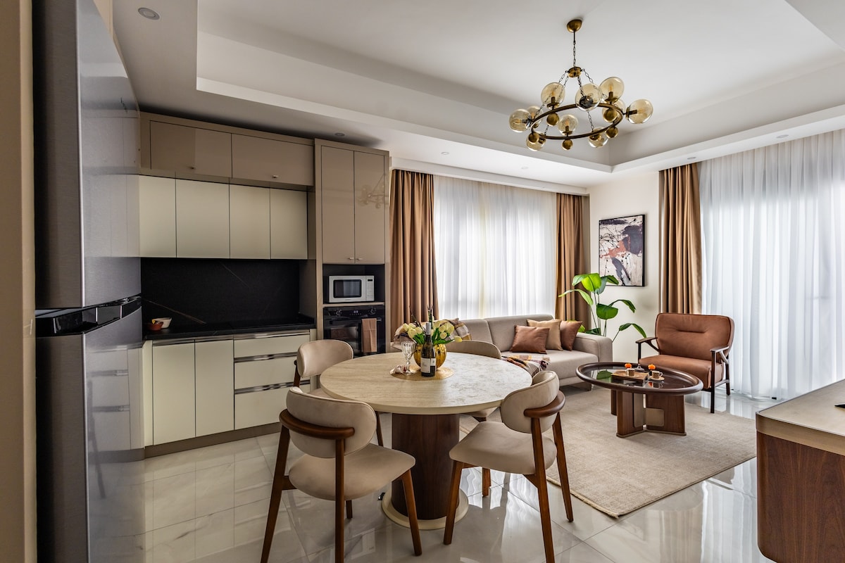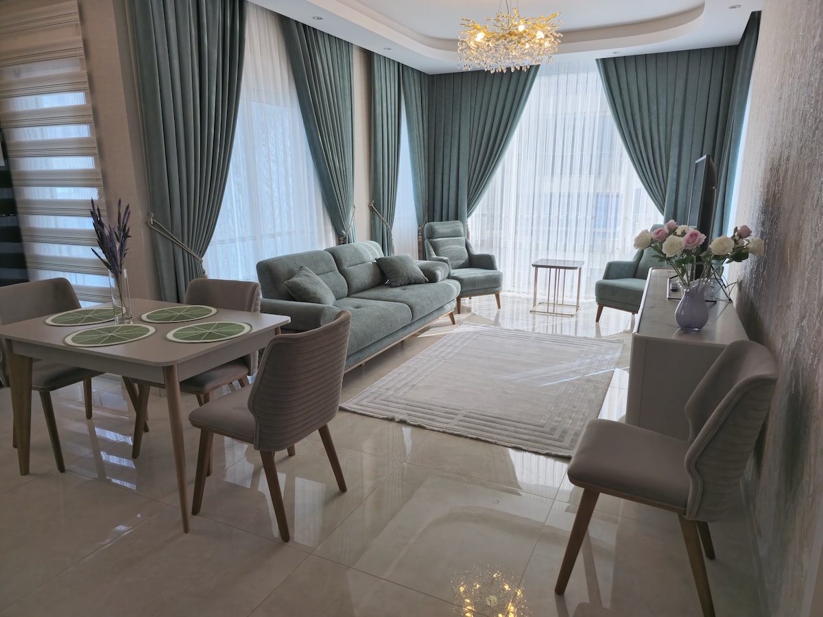 Премиальная квартира 2+1 в Alara Park (Махмутлар), всего 350 м до моря. Современный интерьер, 2 спальни, полностью оборудованная кухня, балкон, Wi-Fi, Smart TV, кондиционеры. Комплекс уровня 5★: бассейны, SPA (хамам, сауна), фитнес, кинотеатр, детская зона, охрана 24/7. Рядом рестораны, магазины и транспорт. Идеально для отдыха, семьи или удалённой работы.