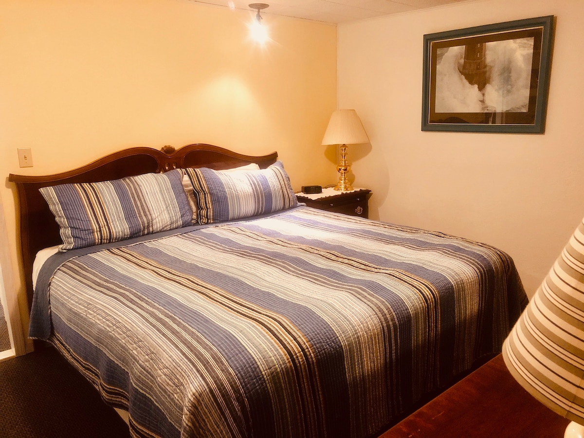 This is a modest, kitchenette with small sitting area and a partial view. It features a bedroom with a king bed. There is a double futon in the sitting area. This unit measures 14X27, excluding the bathroom. This suite has a sitting room, has cable TV, free wireless internet access and private outside entrance on the back deck.