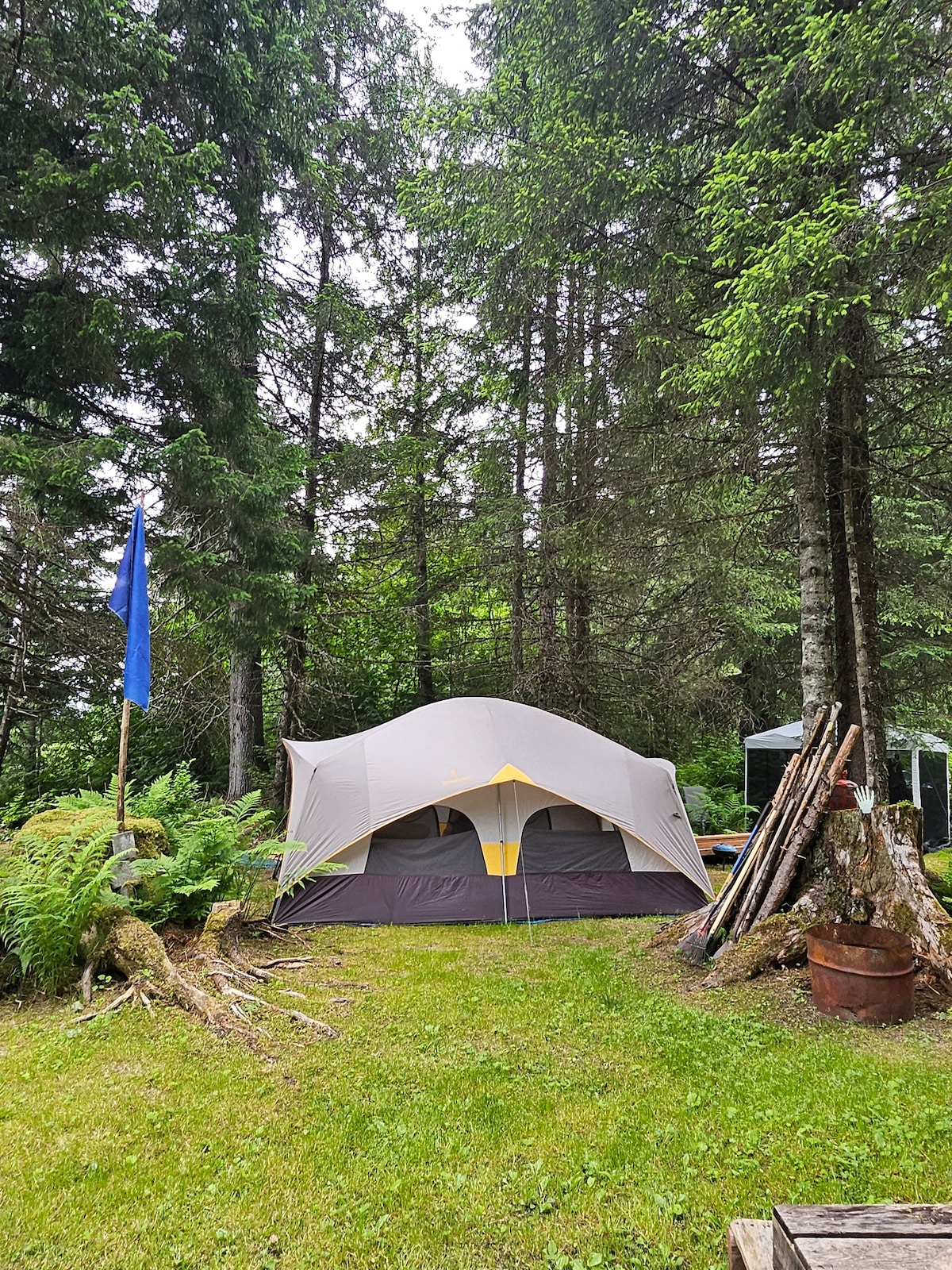 A Get-Away that’s not out of the way. Glamp Camp in an outfitters canvas cabin tent. Bedding provided for two single beds. A double cot is available for your sleeping bags. Close by to Big Lake Recreation Area for swimming & fishing. Nearby are pubs/eateries/laundromat. Enjoy this private, no smoking, off-grid, dry tent camp in the forest. Firewood & firepit are provided. Private camp port-a-potty. Free Parking. It’s a little slice of Paradise! You’ll never forget the fun you had camping!