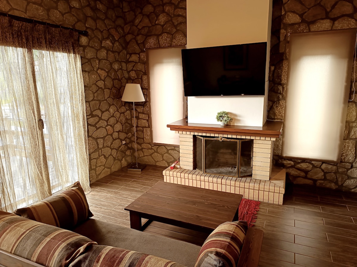 Our villa is spacious & well equipped with one master bedroom , three additional bedrooms, plus a beautiful garret & with two bathrooms. Stone is harmonically combined with wood & classical style while two fireplaces will add a warm feeling to your nights. Every single spot inside the house is a window for the most breathtaking view of the mountain. You will sleep by the burble sound of the rippling flow stream as it travels along the crossing river just outside the house. Pure magic ...