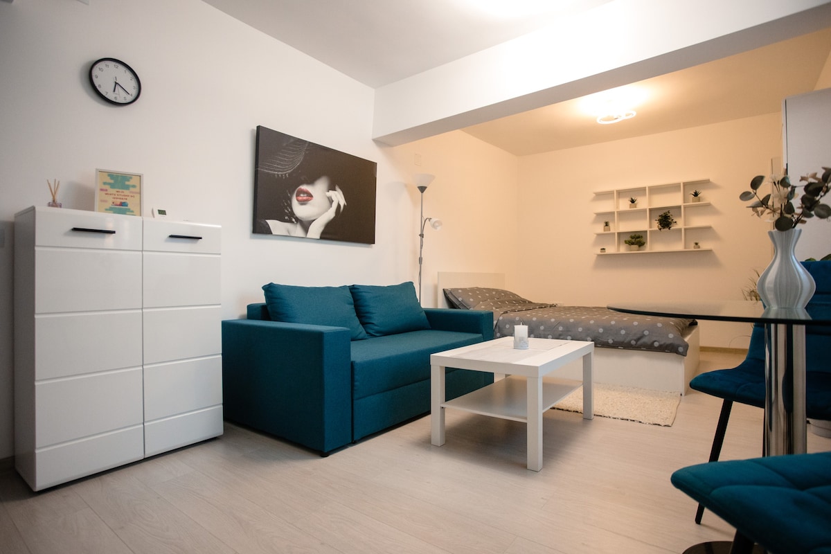 30 m² studio apartment, completely renovated and modernly furnished. Ideal for couples or smaller families Located in an excellent area in Alba Iulia Citadel, central but quiet, with free parking behind the building. It has a fully equipped open space kitchen, bathroom with a shower, king-size bed, sofa bed, Smart TV, and fast Wi-Fi Shops, a pharmacy, a grocery store, and a bus stop are in front of the building Just a 15-minute walk from Alba Carolina Citadel and 3 minutes from Victoria Stadium