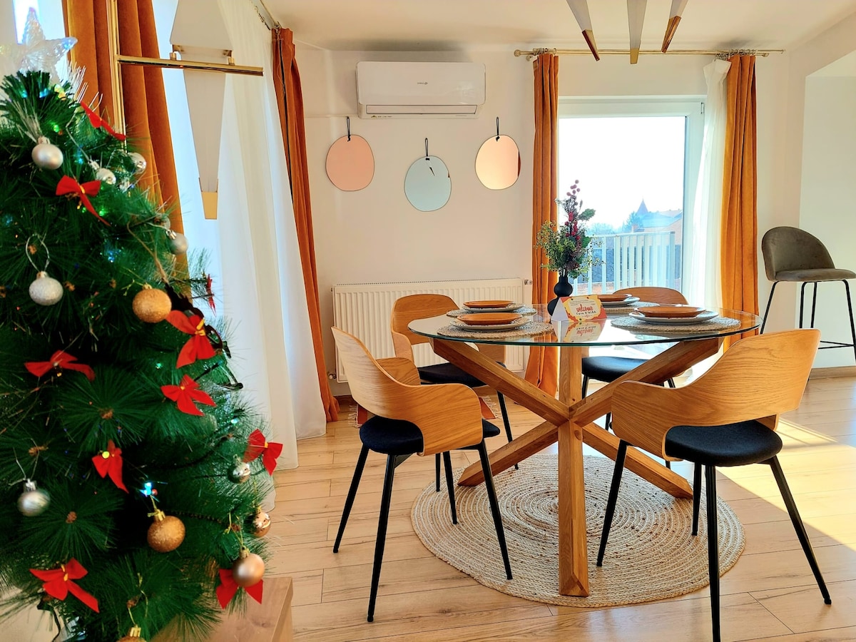 Apartamentul dispune de o panorama a centrului orasului Turda si este amenajat in stil modern. In apartament se gasesc toate cele necesare, precum si cafea, apa, fructe, etc, gratis. Este situat la 2-3 minute de mers pe jos de parcul central din Turda si la vreo 10 minute cu masina, de Salina Turda.