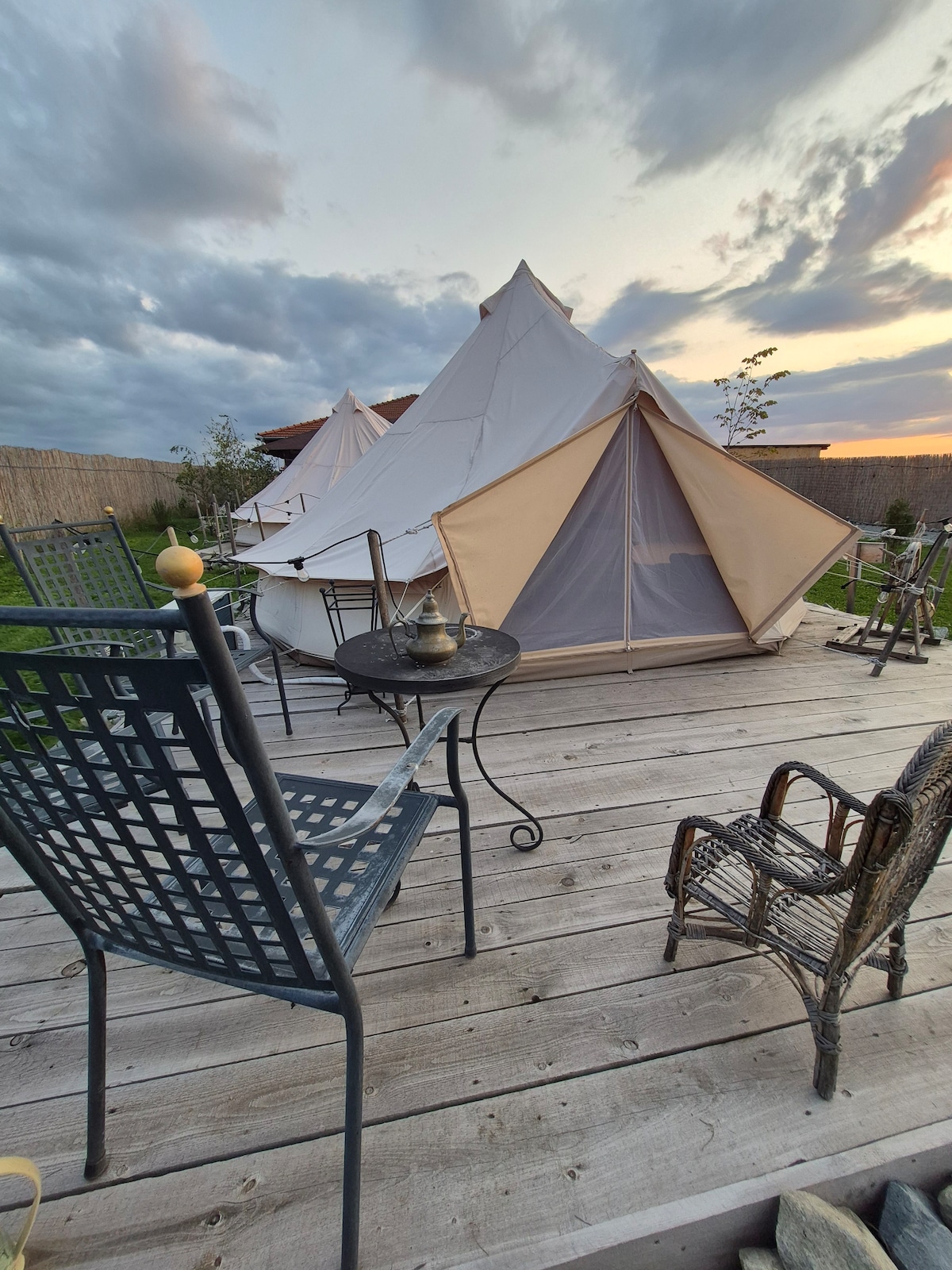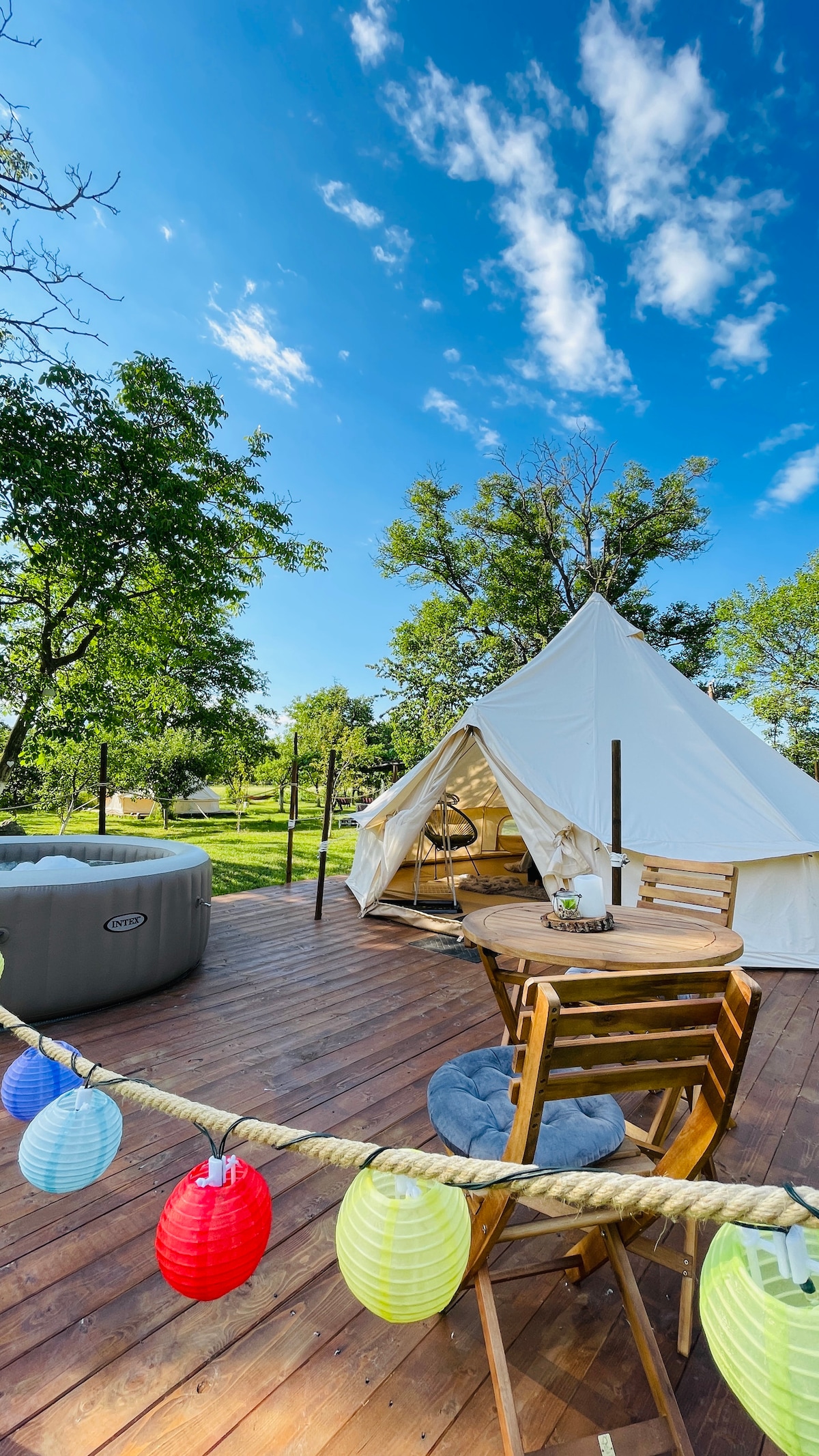 Just 1km from Turda center and Salina Turda, our campsite is a quiet oasis. Stay in a stylish bell tent at Camping La Foișor with a large bed (1.80mx2m) and extra mattress. Amenities: • Swimming Pool • Shared Wooden Pavilion: Grill, Fridges, Place to Dine, Cutlery • Recreation: Relax in the hammocks, and let kids enjoy the playground and trampoline. • Shared bathrooms with four toilets and 3 showers.