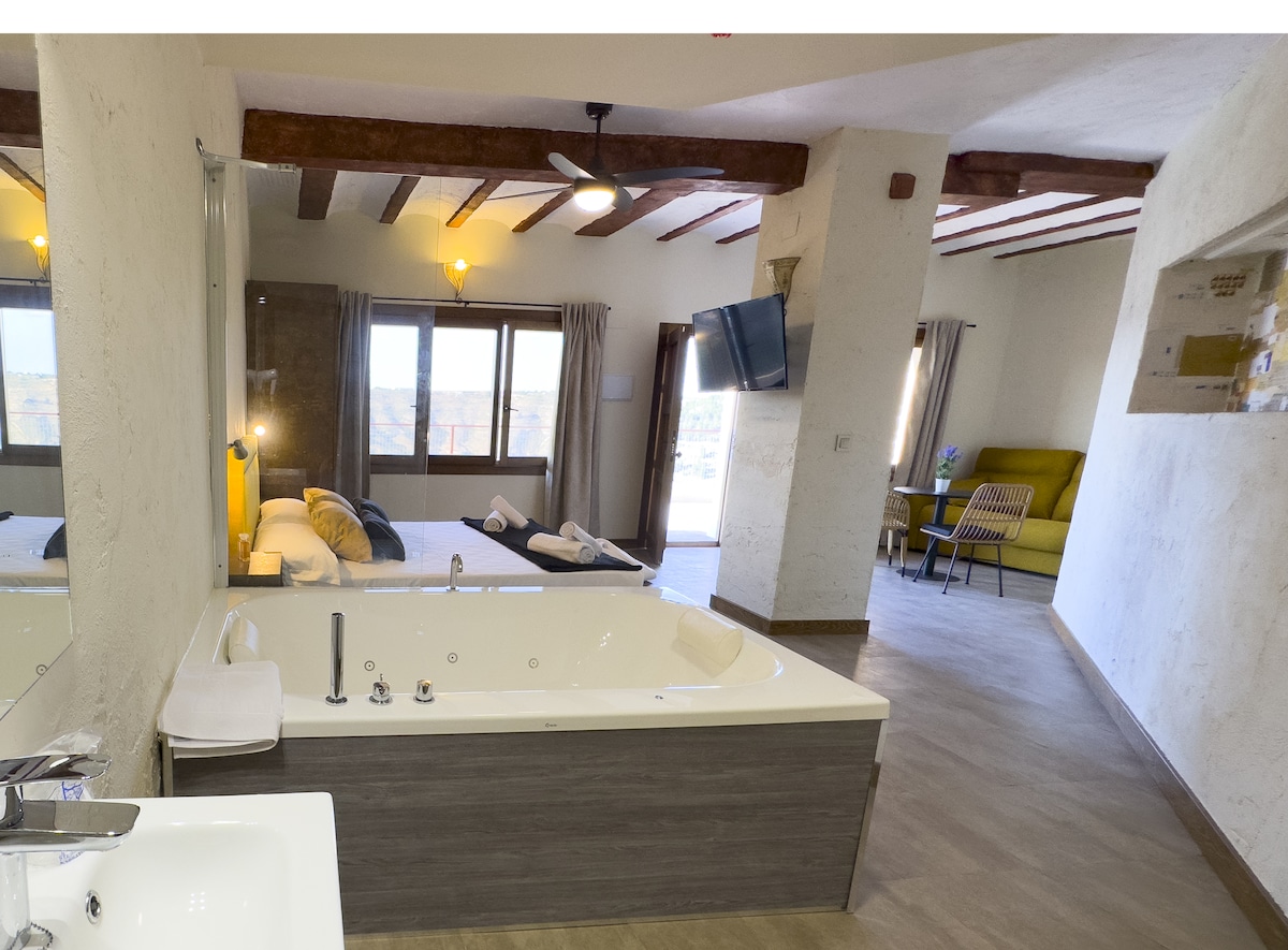 Un refugio acogedor donde el descanso, el paisaje y el confort se unen para crear una estancia inolvidable. Alkalea Hospedería es un alojamiento rural singular con desayuno incluido rodeado de la naturaleza del cañón del río Júcar. Esta suit con jacuzzi es la más grande y exclusiva del hotel.