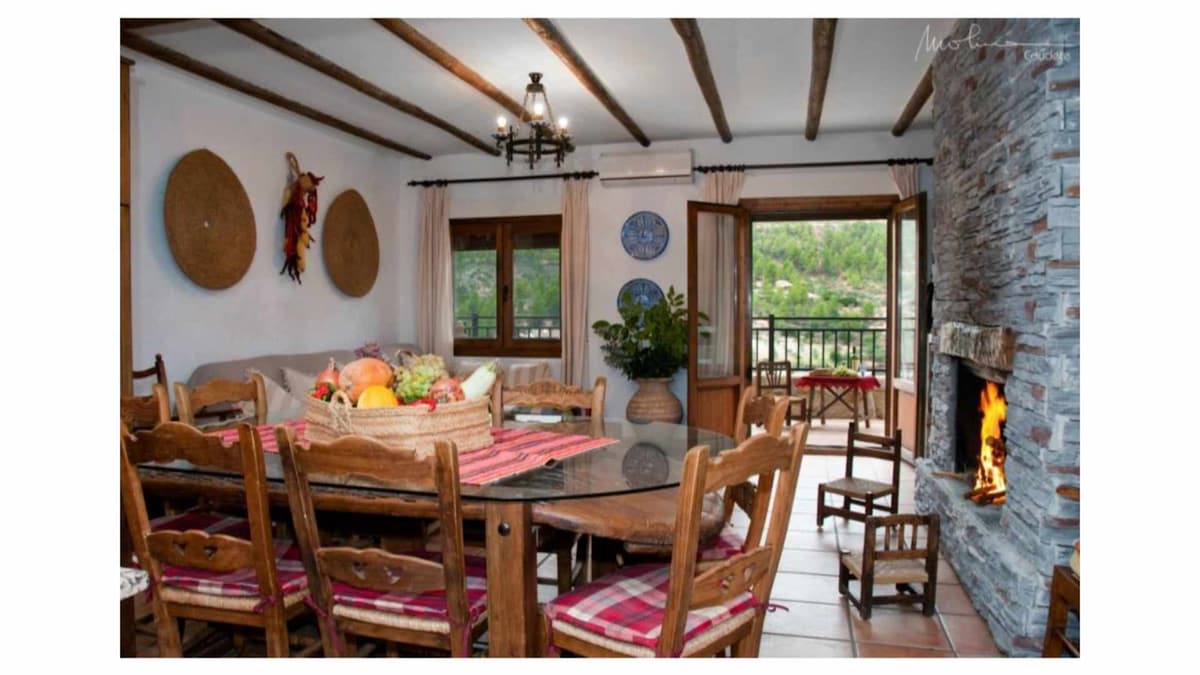 En este alojamiento se respira tranquilidad: ¡relájate con toda la familia o amigos! El alojamiento con su porche y barbacoa es independiente y privado. Está en una parcela 5000m2, con aparcamiento, piscina, canasta de baloncesto, Wi-Fi, ... esta zona es compartida con el dueño y/o con otros huéspedes. Hay varias zonas de baño en el río Cabriel, también hay varios manantiales (todos de aguas termales, 27grados) con sus balsas naturales, como se ve en las fotos.
