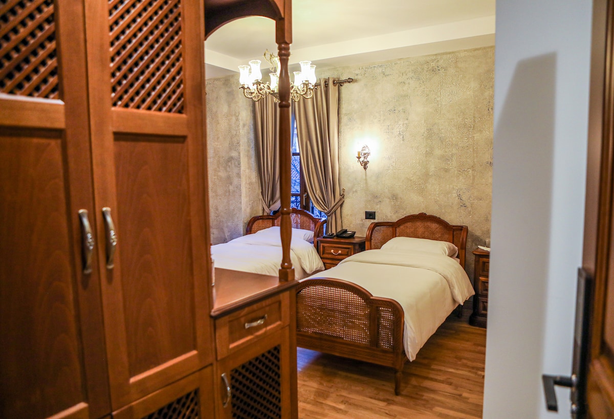 Stay in the heart of Gjirokastër’s Old Bazaar in a cozy twin room with stone walls, wooden furniture and traditional lace details. Enjoy comfort, WiFi, AC/heating, private bathroom, and fresh linens. Steps from artisan shops, cafés and the Castle. A quiet, authentic and warm stay in a UNESCO city.