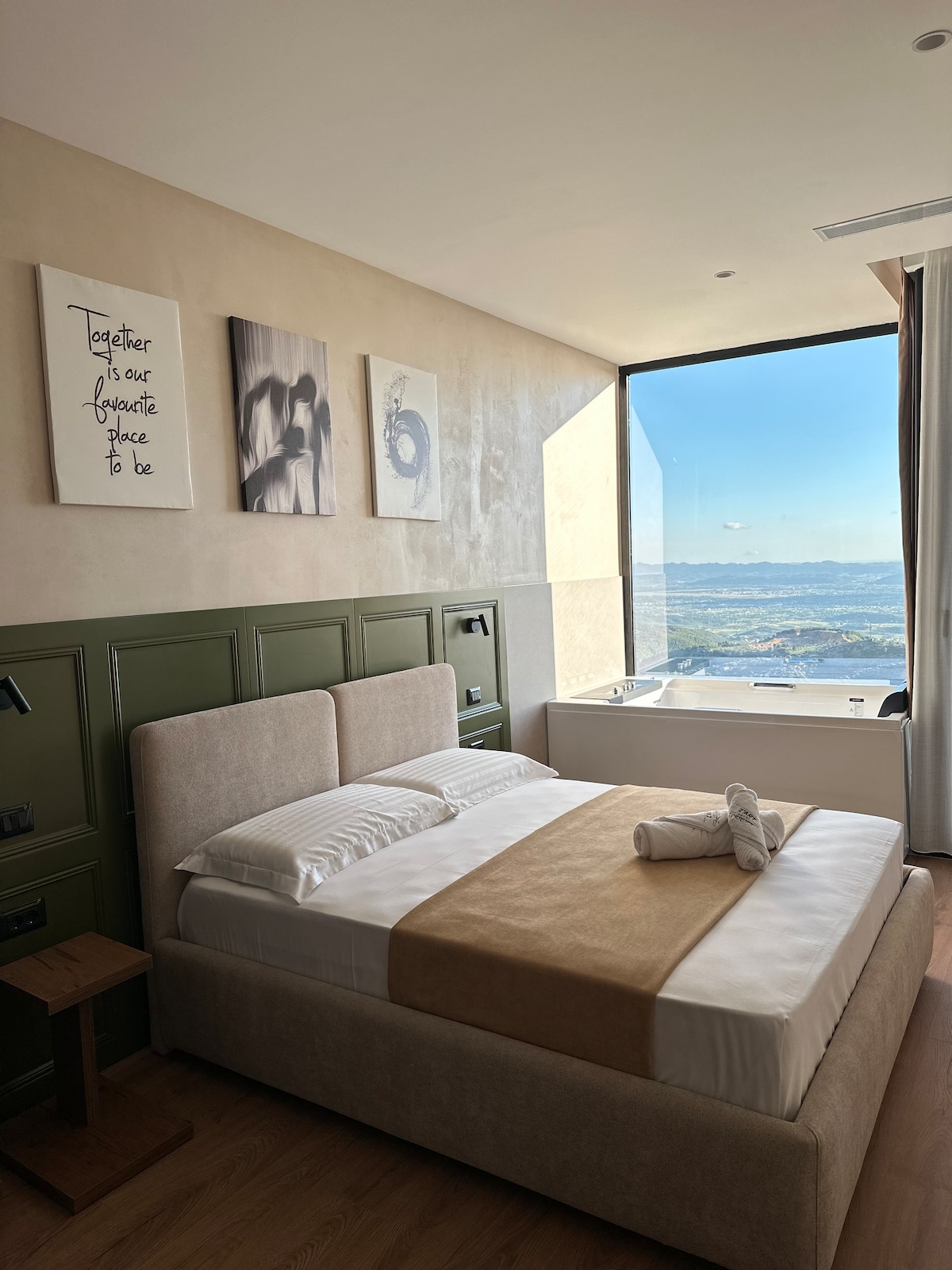 Introducing our luxurious hotel room 201, located 2 min away from the old bazaar of Kruja and the city center. Situated on the 3rd floor, this modern oasis boasts a jacuzzi and breathtaking city views. Enjoy the area with an open wardrobe and a Smart TV with Netflix for your entertainment needs. You'll find yourself just minutes away from the historic Kruja Castle and surrounded by a plethora of dining options, cafes, shops, ATMs, bakeries, currency exchange services, pharmacies, souvenir shops.