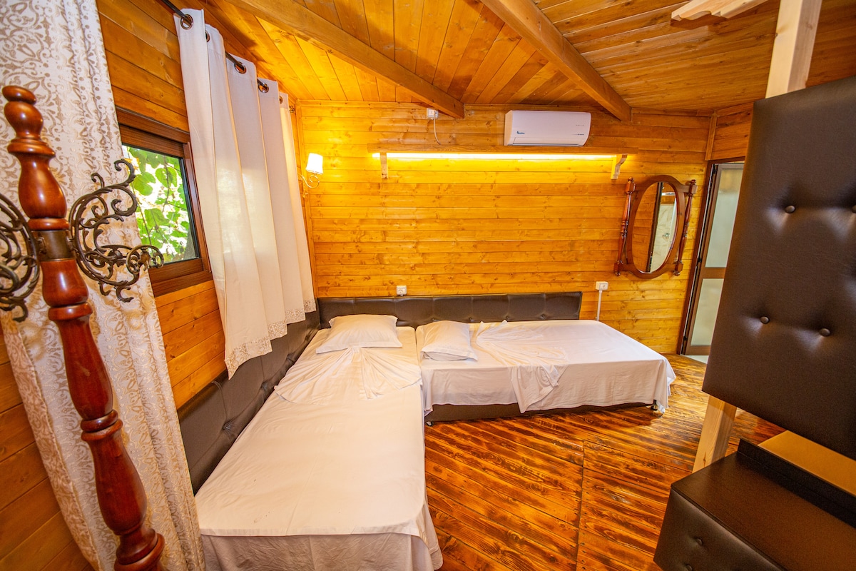 It is a hand made chalet into the Camping legjenda's mulberry forest.There is a painting and a tifany artwork on the walls.Also a small veranda stands in front of it,facing the forest .