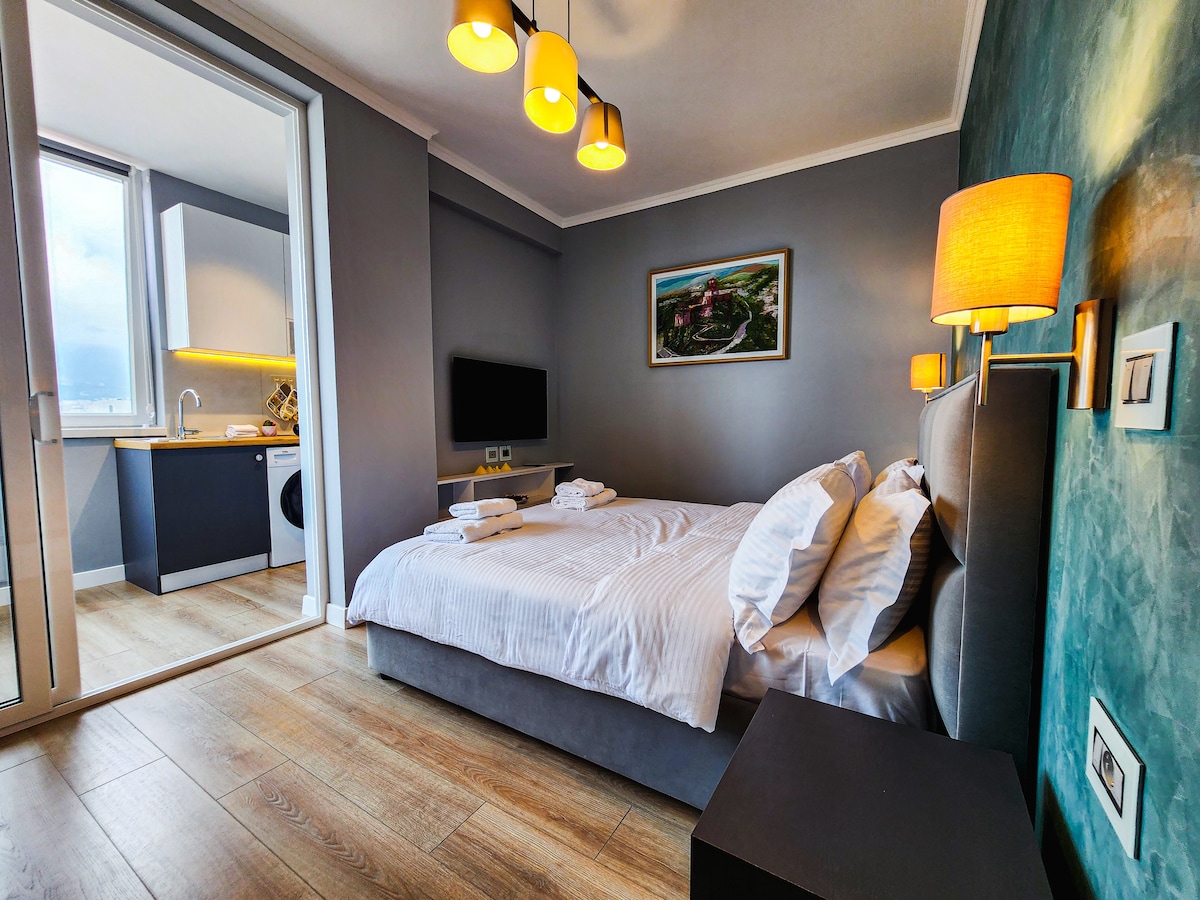 Welcome to our stunning studio apartment located on the 9th floor, offering an amazing view of the surrounding cityscape. This exceptionally stylish space is perfect for solo travelers or couples seeking a unique and elevated experience. With a thoughtfully modern kitchenette, and a comfortable sleeping area, you'll enjoy both the stylish interior and the breathtaking views from your high vantage point.