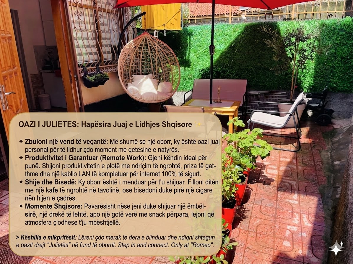 Private apartment (33 m²) with a 30 m² outdoor area, located in the heart of Tirana’s historic center. Just a short walk from Skanderbeg Square, Blloku, and Mother Teresa’s house. Includes kitchen, bathroom, Wi-Fi, and A/C. The outdoor space is ideal for relaxing, and you can safely park bicycles or a scooter. Quiet and convenient location, perfect for exploring the city on foot.