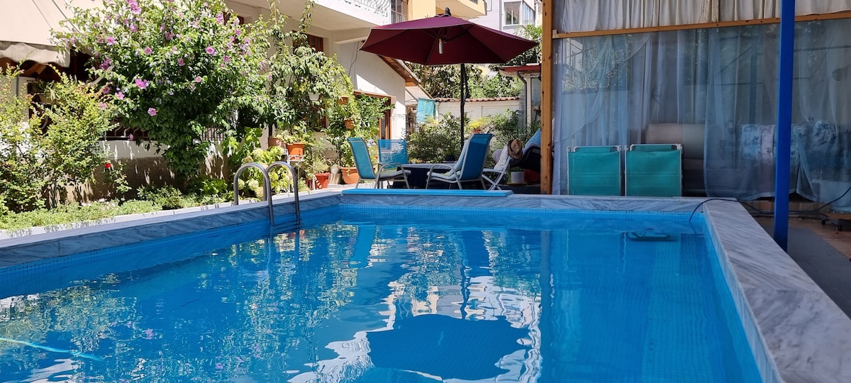 Luxurious pet-friendly guest house only 7 minutes from our city center. This oasis of peace amidst Tirana's busy modern life, is completely independent with a cozy kitchen, lovely and spacious bedroom, working space, and a bathroom. Our guests are free to use all of the fantastic gardens and outdoor pool:) This idyllic workspace can become your temporary atelier as well! Simply, the perfect place to stay to work, relax and get inspired!