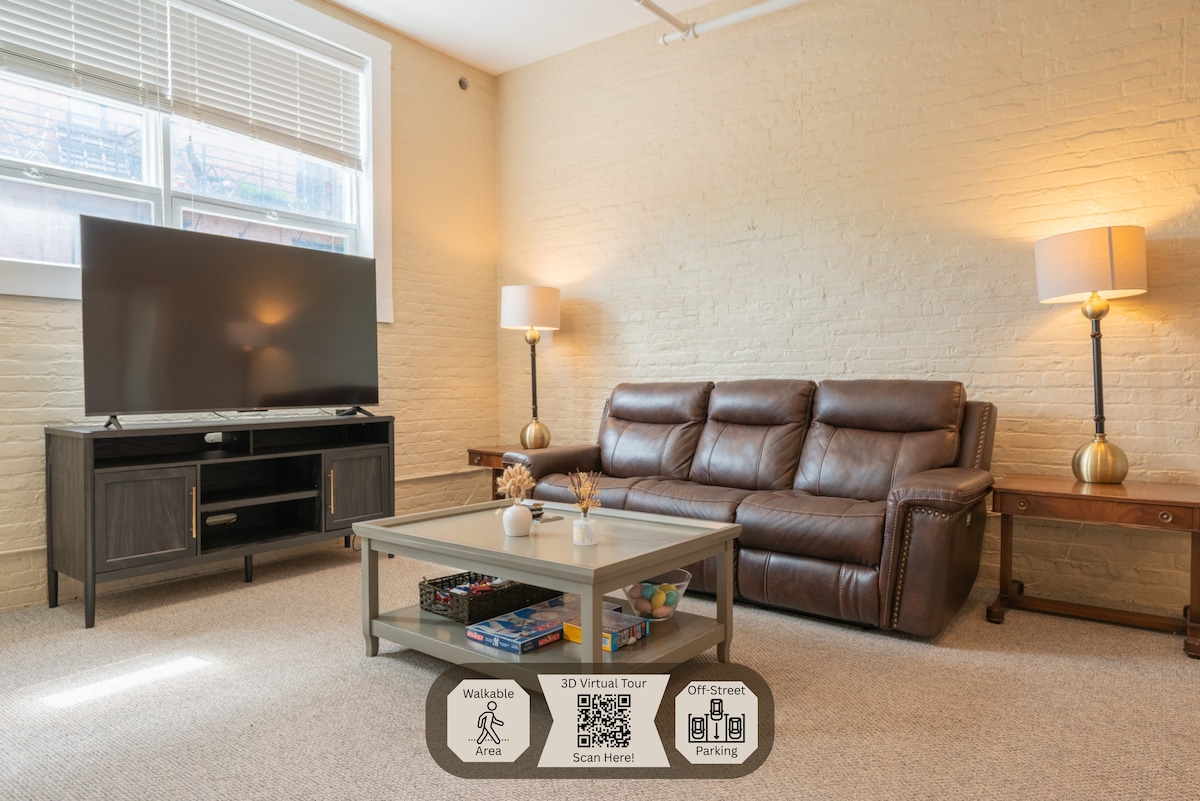 Charming 2 Bedroom + Workstation apartment in Downtown Albany. Centrally located and easy walking! NFL Blitz Arcade Game. Pets allowed! 2nd FL apartment with an elevator on site! Enjoy hardwood floors, a custom kitchen, soaking bathtub, and central AC. Featuring a King Bed, Queen bed, pull-out couch, workstation with monitor, and free WiFi. Includes access to a shared washer/dryer. For long term stays over 1 month, a monthly parking space will be included. Parking garage close by.