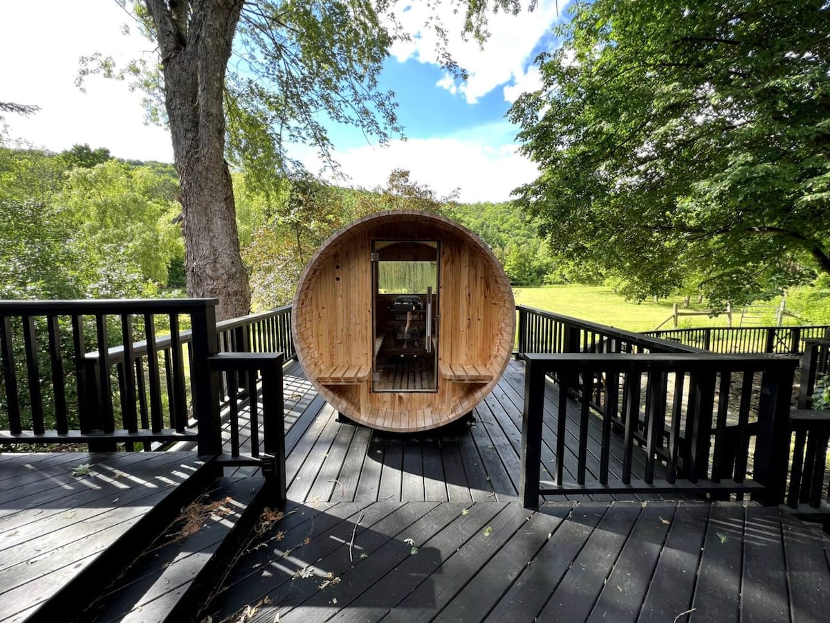 25 mins to HUNTER MOUNTAIN, 30 to WINDHAM. Cozy catskills getaway at the bottom of the escarpment. Hidden, private, on the way to your ski trails. Backyard pond + trail, mountain views, treehouse w games, jacuzzi, hammocks, firepit, outdoor speakers, private bathroom sauna w swim pond view, 3 interior bedrooms including a fun bunkbed & foozball, extra cottage in back, the fun here is endless. Minutes from valleys, creeks, mountains, hikes, waterfalls, reservoirs, trails + AN AWESOME HOST :D