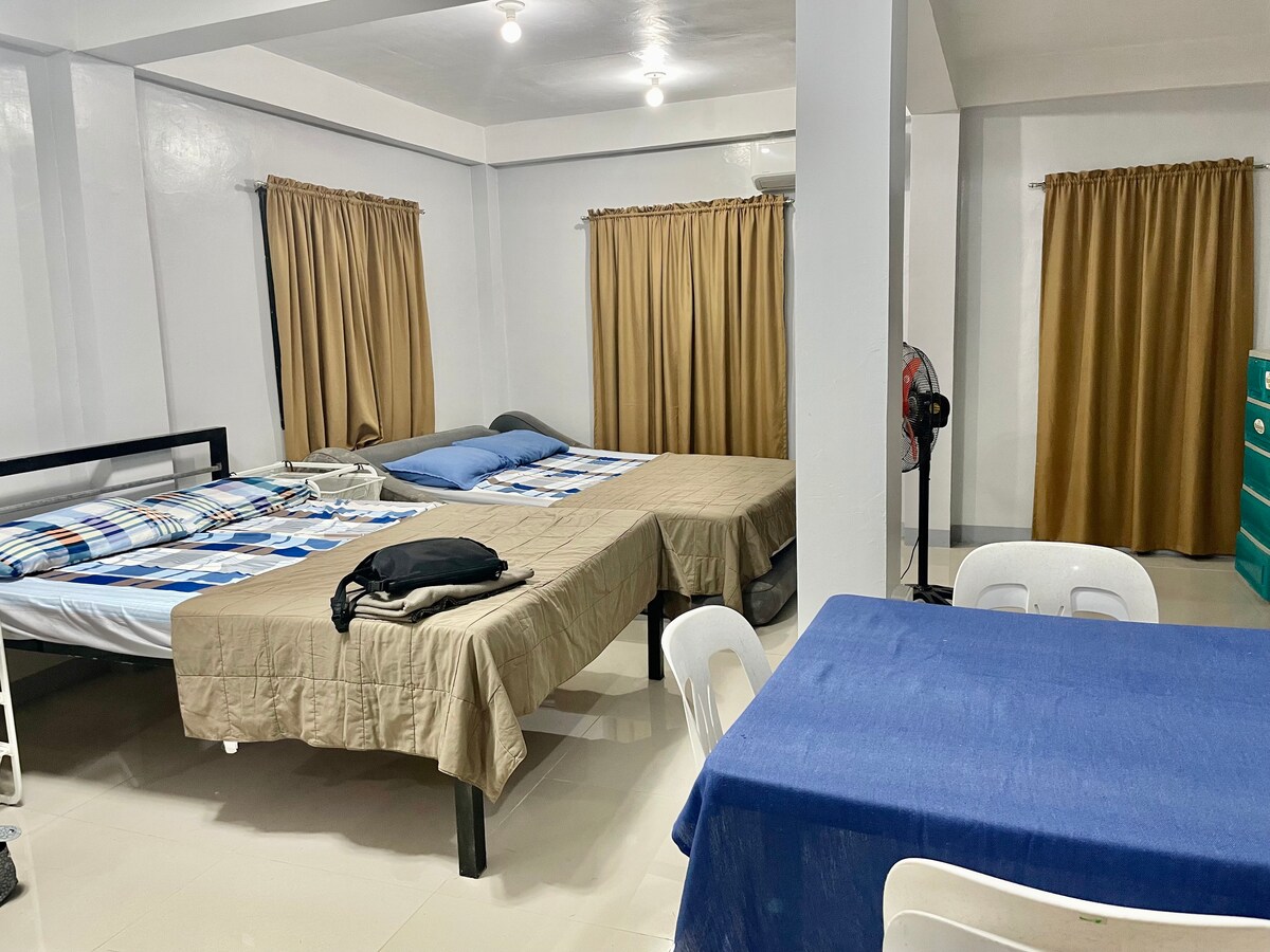 Renovated and removed the partition so now only 1 bedroom with 2 queen beds. 1 CR...It is located on the 3rd floor with separate entrance from the main house. The main house has a generator including room for guests, hot and cold water or shower, best for family or friends. Room can accommodate 4 persons ...Airconditioned.... no charge for children... we no longer serve breakfast ever since Covid 19 ... but we will provide you with stove, rice cooker and kettle