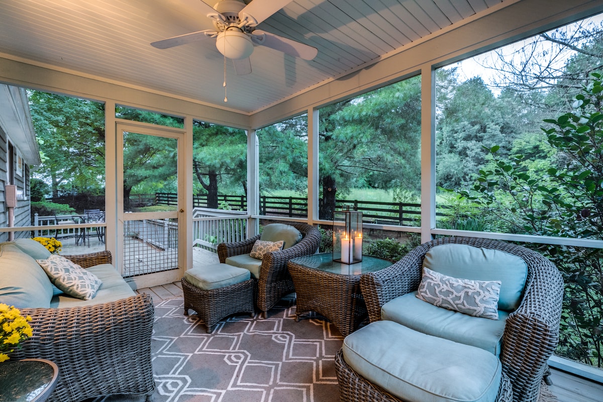 Relax at this unique and tranquil getaway. Sit on the screened in porch and enjoy the sights and sounds of nature while you enjoy a beverage. Visit the Downtown Mall, Monticello, a Winery, a Brewery, or UVA (20 min). Enjoy a dip in the pool (JUN-AUG) or relax by the firepit - perhaps joined by a Great Pyrenees for cocktails. Feel like staying in - SmartTVs with YouTubeTV (which includes local channels) and Gig-speed Internet await. Easy checkout. No cleaning fee.