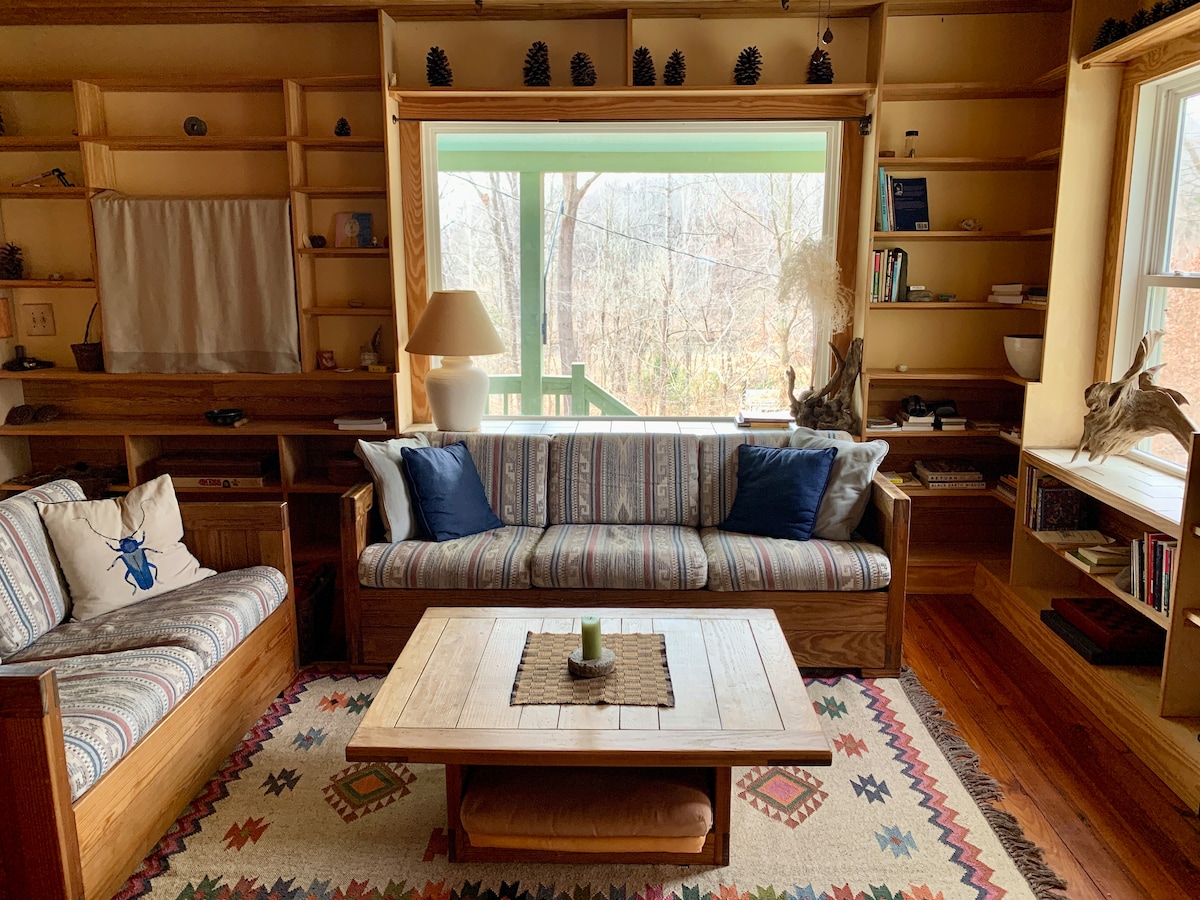 Solar powered cottage with 15 foot ceiling, sleeps four, This unique place has a style all its own. Italian fold out couch and a loft. kitchen and outdoor deck. It Is 75 feet from our house. We are 1.0 mile from the Downtown Mall of Charlottesville in Historic Woolen Mills, 5 blocks from the Rivanna River and Park. Off street parking, 250 sq ft plus loft. Has lots of light. Enjoy fresh eggs from our chickens!there is so much in our area from hiking to eating to contemplating