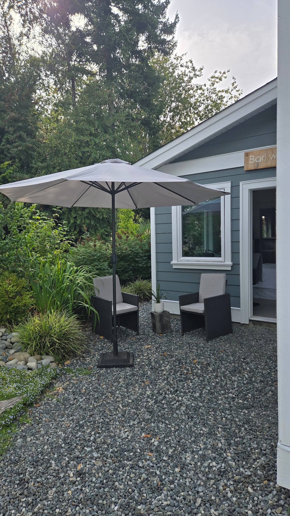 The Little Bay suite offers views of our forest and brings the outside in with the bay door opening for outdoor enjoyment. A small, well stocked kitchenette offers microwave, toaster oven, kettle, coffee maker, coffee, sink, bar fridge and a bbq on the covered patio. Satellite TV and wifi. This unit has a nice patio space & seating for 2. We hope you enjoy our space! Max 2 guests- no little ones please. Please request a dog- no cats. Endlessride Surf School offers daily lessons.
