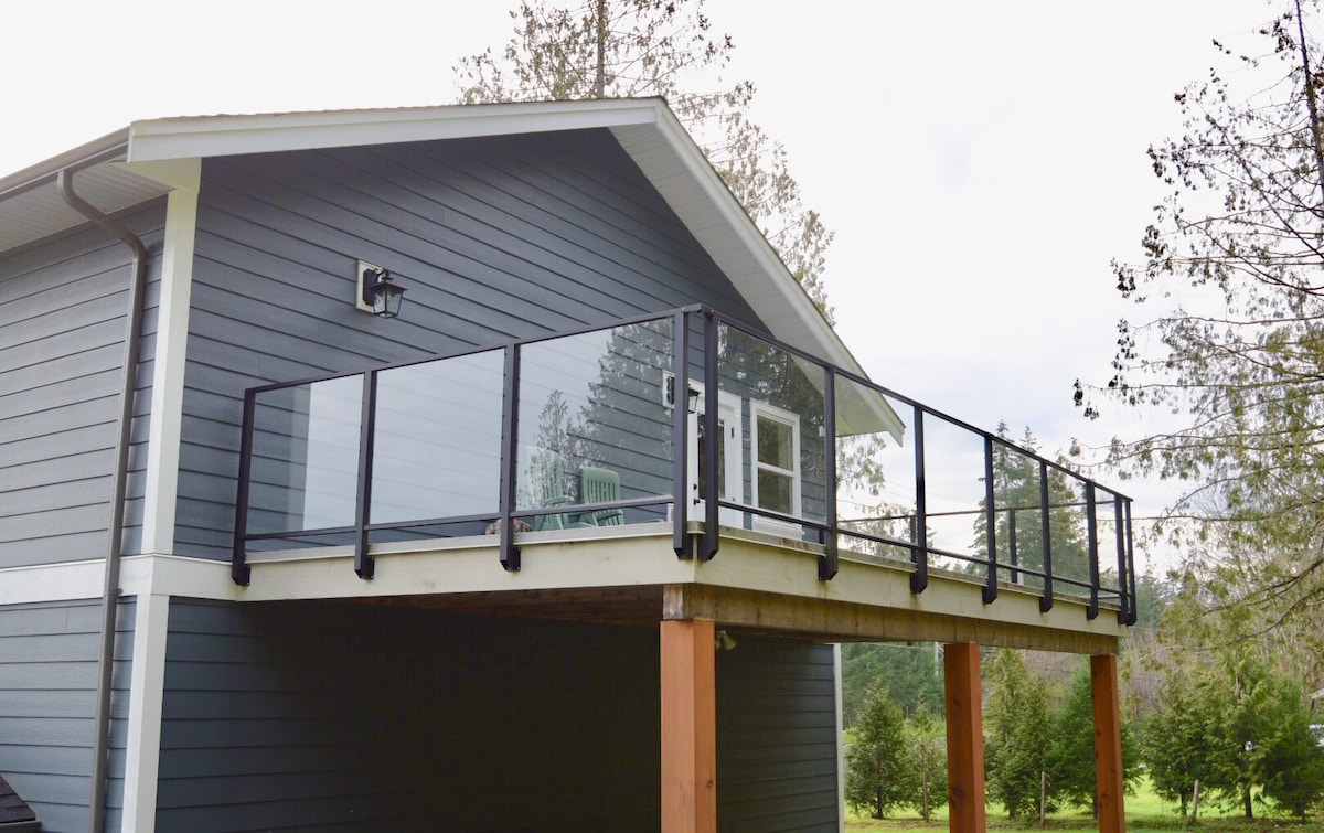 This immaculate guest house with its private deck and generous living space invite comfort. It boasts a unique country charm with many handcrafted pieces of furniture along with a longboard made from cedar. Sleeps 6 comfortably with 2 bedrooms, ( 1 king & 1 queen), along with a queen sofabed. One bath with shower, laundry room, and a fully stocked kitchen, you have everything you need to feel like you are at home. Located in the country with trails close by, and only 5 min away from shopping.