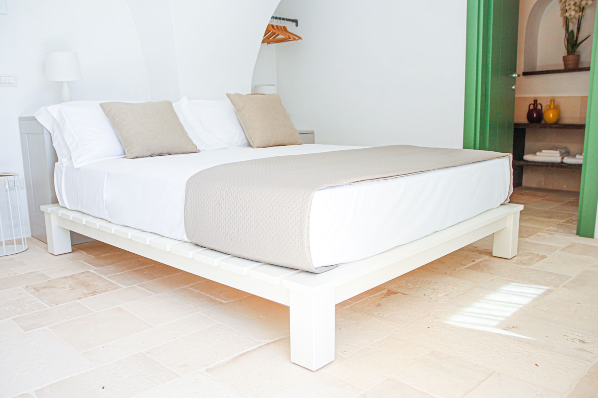 Ampia camera all'interno dei trulli. Nel contesto di una piccola masseria immersa nella natura e tra gli animali. A pochi minuti dal mare e dai principali centri della Valle d'Itria. Offriamo una ricca colazione con prodotti esclusivamente fatti da noi o da produttori locali.