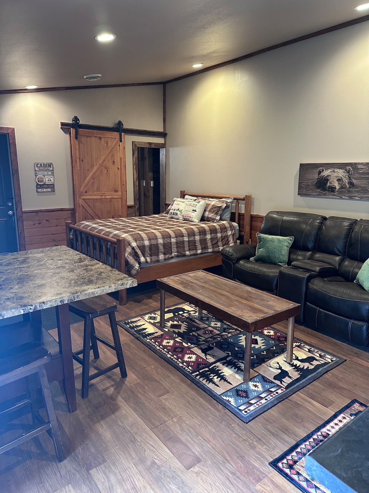 This barn refinished into a rustic cabin will give you the feeling that you are in the middle of the woods while having the convenience of being in town. Located just minutes from downtown Clear Lake, the historic Surf Ballroom, and City Beach, this is the perfect get-away spot! A large upper loft makes this a great option for families with kids or a peaceful adult retreat. Pets are family... so we are pet friendly, but do add a $25 dollar pet fee (per pet) for the duration of your stay.