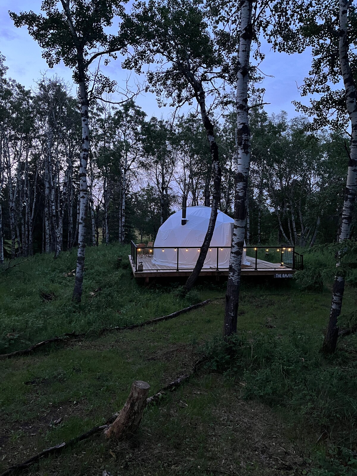 The Raven (Dome #2) Enjoy the magic of the stars, northern lights and nature! This unique stay is on our 100yr old family farm. Come experience something beautiful as we revive our family farm into a special retreat. We have 3 geodesic domes ready to welcome you! Your glamping experience includes a cozy queen size bed, open sky dome, a wood stove, large deck and private 2 person hammock to enjoy the outdoors! +more We now have a sauna, firepit, bathroom, and a shelter with BBQ!!!