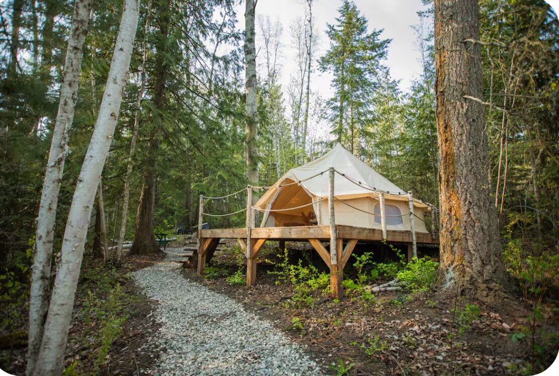 Experience the Ultimate Glamping Getaway in Golden, BC! Wake up to breathtaking panoramic views right from the comfort of your glamping tent! Nestled in the heart of nature, our cozy canvas wall tents provide the perfect balance of outdoor adventure and modern comfort. Hot Shower, Electricity and shared kitchenette with BBQ and cookstove. 12 Min from the town of Golden. 21 min from Kicking Horse Mountain Resort, 10 min from The Golden Sky Bridge & 30 min from Yoho National Park or Glacier NP.