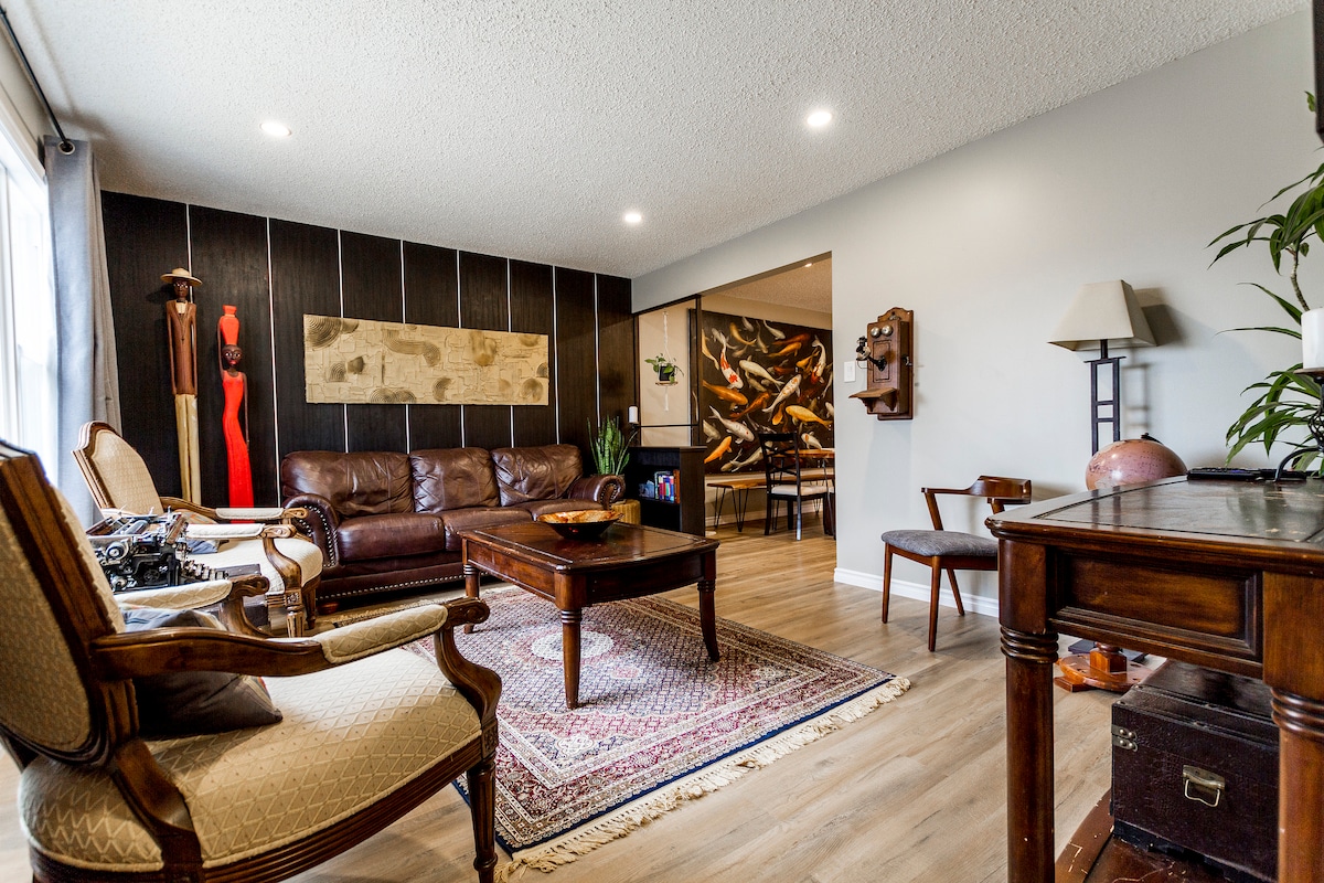 **Just 2 BLOCKS from Valley Line Transit (LRT) Enjoy a relaxing stay in this unique property, surrounded by one of a kind antiques and cheerful art. It is conveniently located in King Edward Park just minutes from Whyte Ave, downtown, grocery stores, parks, trails, restaurants and more! Bring your dog along and enjoy everything Edmonton has to offer. A fully stocked home with all your must have amenities like coffee, tea, sugar, oil and vinegar, shampoo, conditioner and even a soda stream.
