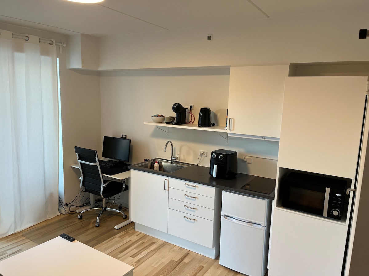 Lejligheden er perfekt til både korte og længere ophold. Lejligheden består af et fuldt udstyret køkken, et moderne badeværelse, et soveværelse med komfortabel seng, en rummelig stue samt et ekstra værelse, der kan bruges som kontor eller andet. Du kan nyde morgenkaffen på altanen, og der er gratis parkering i ejendommen. Der er gåafstand til både togstation, supermarkeder og et stort udvalg af restauranter og caféer. Ideel for både feriegæster og forretningsrejsende.