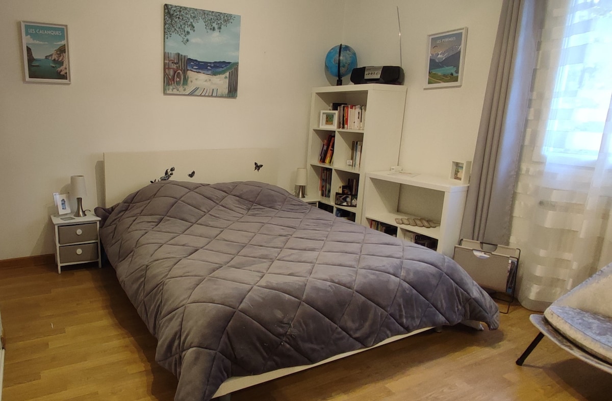 La CHAMBRE (sans cuisine) est entièrement autonome, toilettes et salle de bain privatives, accés par une entrée réservée au logement. Elle se situe dans une partie de notre maison et peut accueillir idéalement 2 personnes (jusqu'à 3 si besoin, supplément de 10€/nuit). Dans le cas où le 2ème couchage (fauteuil convertible en lit d’appoint 1 place) est nécessaire, même à 2 voyageurs, 10€ supplémentaires vous seront demandés à votre arrivée. La chambre est à rendre propre (ou forfait ménage 10€ )